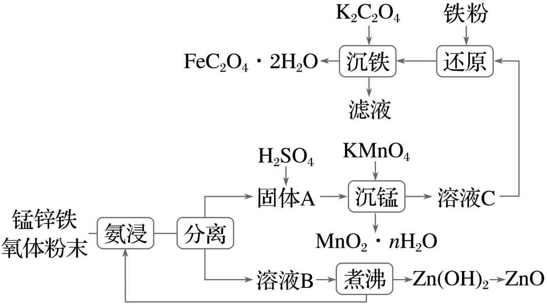解析锰锌铁氧体经过氨浸后,分离得到的溶液B经煮沸得到氢氧化锌,则氨浸的作用是将锌元素转移到溶液B中,将分离得到的固体A溶于硫酸,得到含锰、铁元素的溶液;沉锰过程中,KMnO4与Mn2+发生归中反应生成MnO2·nH2O;由于加入铁粉还原,则溶液C主要含三价铁离子,铁粉将铁离子还原为二价铁离子,加入K2C2O4沉铁,将二价铁离子转化为FeC2O4·2H2O。