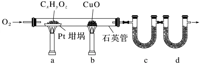 解析(1)实验前,应先通入一定量的O2排尽石英管中的空气,保证没有其他产物生成,而后将U形管c、d与石英管连接,检查装置气密性,随后先点燃b处煤气灯后点燃a处煤气灯,保证当a处发生反应时产生的CO能被CuO氧化生成CO2。(2)有机物氧化不充分时会生成CO,而CuO可将CO氧化为CO2,反应的化学方程式为CO+CuOCu+CO2。(3)有机物燃烧后生成的CO2和H2O分别用碱石灰和无水CaCl2吸收,其中c管装有无水CaCl2,d管装有碱石灰,二者不可调换,因为碱石灰能同时吸收水蒸气和二氧化碳,影响最后分子式的确定。(5)n(H)=
