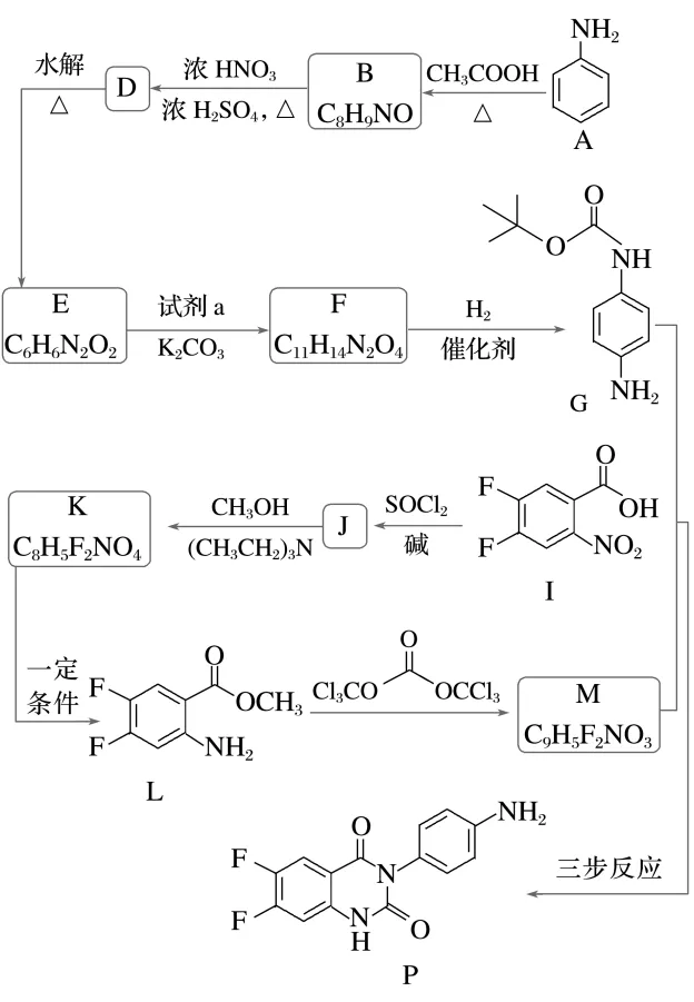 。(3)试剂a中有一种等效氢原子,核磁共振氢谱显示一组峰,a错误;J→K生成物有HCl,加入碱性物质(CH3CH2)3N,与生成的HCl反应,促进反应正向进行,b正确;根据分析,F→G与K→L的反应均为硝基转化为氨基,为还原反应,c正确。