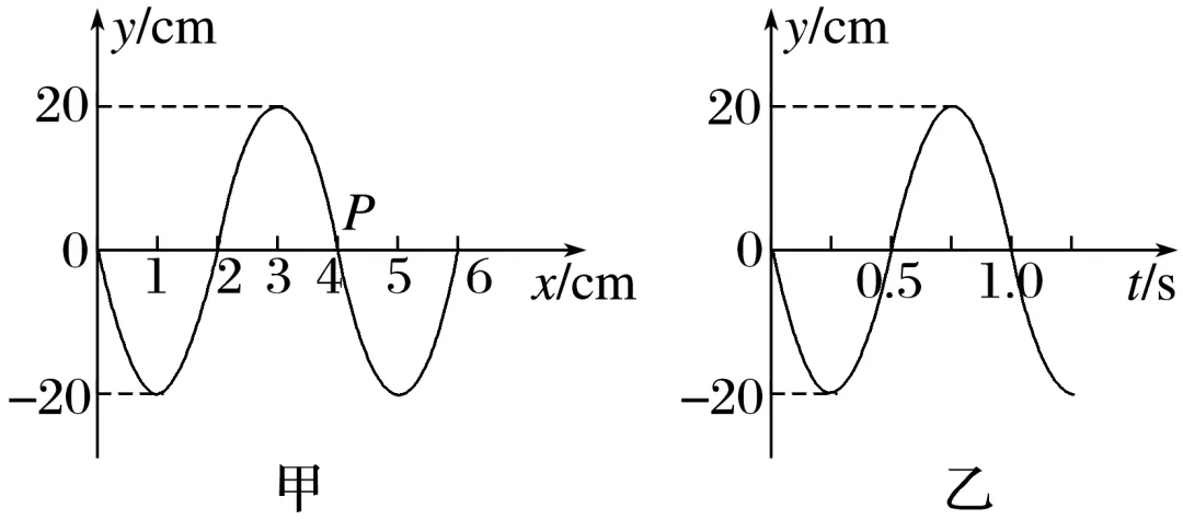 解析根据题图乙可知t=0.5s位于x=4cm处的P点向上振动,则t=0.5s位于x=2cm处的质点从平衡位置向下振动,由题图乙可知周期为T=1s,可知t=0时刻,位于x=2cm处的质点从平衡位置向上振动,则位于x=2cm处的质点振动方程为y=Asin