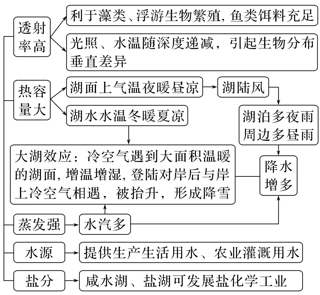 淡水湖 | 与外流河相通,湖水易与河水交换,循环更新周期短,盐度低 | 主要分布在外流区(或降水较多的地区) | 鄱阳湖、洞庭湖、北美五大湖、贝加尔湖等 |