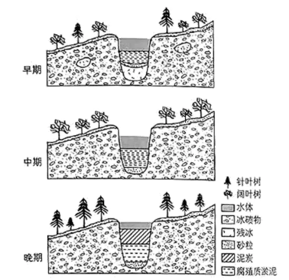 帕里索夫湖位于波德平原,是末次间冰期(距今约13万~11.5万年)古湖泊,该湖泊发育于大陆冰盖消退后的孤立冰碛高地上,其周边冰碛物孔隙大,且早期冰碛物内部夹杂残冰。研究表明:该湖演化过程中曾因干旱发生过干涸,但其周边湖泊未发生此现象。下图示意帕里索夫湖末次间冰期演化过程。