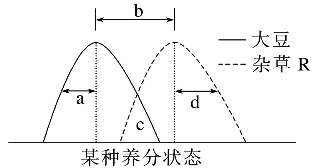 解析 生态位是指一个物种在群落中的地位和作用,包括所处的空间位置,占用资源的情况,以及与其他物种的关系等,因此a越大,说明大豆获取养分的范围越大,大豆个体间对该养分的竞争越小,A错误;b越小,大豆和杂草R的生态位重叠度越大,表明二者对该养分的竞争越大,B错误;环境发生改变,大豆、杂草R生态位都会发生改变,从而使得a、b、d均发生改变,C错误;当c为0时,大豆和杂草R对该养分没有竞争,表明二者生态位发生了分化,D正确。