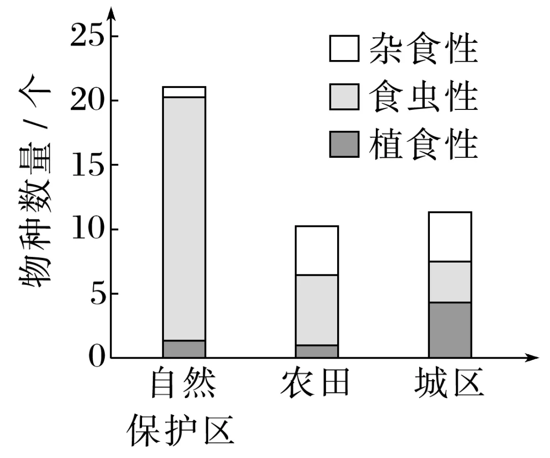 解析 分析题图可知,与农田、城区相比,自然保护区的雀形目鸟类的物种数量最多,鸟类物种丰富度高,植被类型多样,A正确;由于农田中鸟类的物种数量少于自然保护区的,故农田中的鸟类比自然保护区鸟类的种间竞争更小,B正确;由题图可知,自然保护区食虫性鸟类占绝大多数,说明自然保护区的杂食性和植食性鸟类比其他生境的杂食性和植食性鸟类有更窄的空间生态位,C错误;城区杂食性鸟类的种类较多,说明人类活动产生的空白生态位有利于杂食性鸟类迁入,D正确。