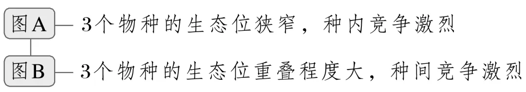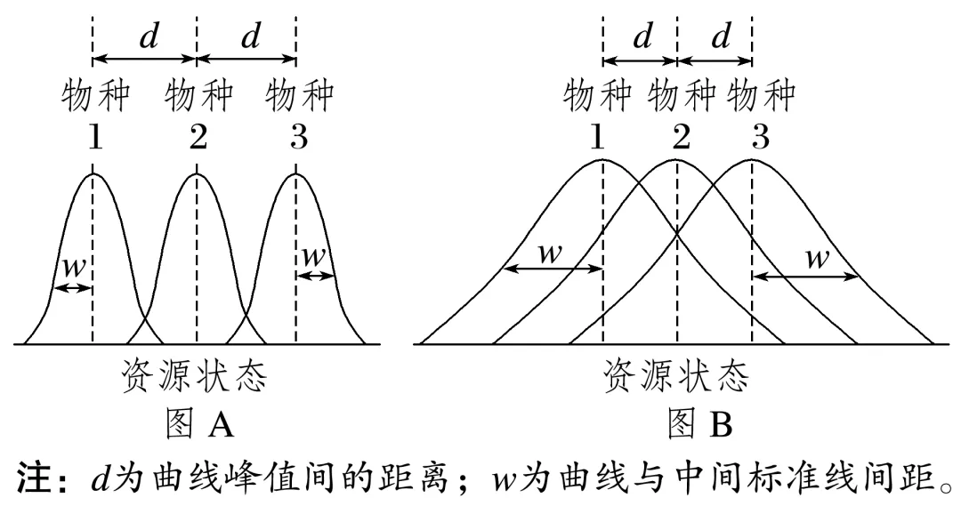 生态位示意图说明:如图为3个共存物种对资源利用曲线。图A和图B中3个物种的资源利用状况不同。