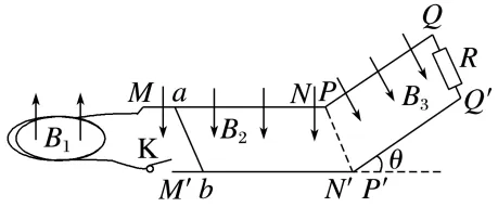 1.(12分)(2025·四川攀枝花市三模)如图所示,一个匝数n=1 000、面积S=100 cm2的水平圆形线圈内有竖直向上的匀强磁场B1,磁感应强度大小随时间变化关系为B1=B0+0.25t。线圈与右侧的平行导轨MN、M'N'通过开关K相连,导轨MN、M'N'构成的平面为水平面,其内有竖直向下的匀强磁场B2,其右侧有倾角θ=30°的倾斜平行导轨PQ、P'Q',N与P、N'与P'通过一小段(长度不计)绝缘圆弧平滑连接,PP'、NN'连线均与所有导轨垂直。倾斜平行导轨PQ、P'Q'内有与两导轨构成斜面垂直向下的匀强磁场B3,其顶端Q与Q'之间接有定值电阻R。现有一长L=0.5 m的导体棒ab垂直于导轨静止放置在水平导轨上,与导轨接触良好。闭合开关K后,导体棒由静止开始运动,到达水平导轨右端前已经匀速。已知导轨间距均为L、阻值均不计,导体棒ab、线圈、定值电阻的阻值均相同,导体棒ab的质量m=0.1 kg,匀强磁场B2、B3的磁感应强度大小均为1 T,重力加速度g取10 m/s2,不计一切摩擦,求: