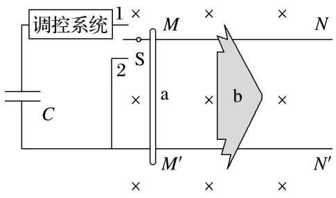 2.(15分)(2025·河北卷·15)某电磁助推装置设计如图,超级电容器经调控系统为电路提供1 000 A的恒定电流,水平固定的平行长直导轨处于垂直水平面的匀强磁场中,a可视为始终垂直导轨的导体棒,b为表面绝缘的无人机。初始时a静止于MM'处,b静止于a右侧某处。现将开关S接1端,a与b正碰后锁定并一起运动,损失动能全部储存为弹性势能。当a运行至NN'时将S接2端,同时解除锁定,所储势能瞬间全部转化为动能,a与b分离。已知电容器电容C为10 F,导轨间距为0.5 m,磁感应强度大小为1 T,MM'到NN'的距离为5 m,a、b质量分别为2 kg、8 kg,a在导轨间的电阻为0.01 Ω。碰撞、分离时间极短,各部分始终接触良好,不计导轨电阻、摩擦和储能耗损,忽略电流对磁场的影响。