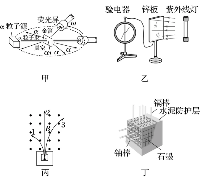 解析题图甲是α粒子散射实验,α粒子穿过金箔后,少数α粒子发生了大角度偏转,故A错误;题图乙是光电效应实验,锌板失去电子,张开的验电器指针和锌板都带正电,故B错误;题图丙是放射源放出三种射线在磁场中的运动轨迹,根据左手定则,1带负电为β射线,故C正确;核反应堆中的石墨起使中子减速作用,故D错误。