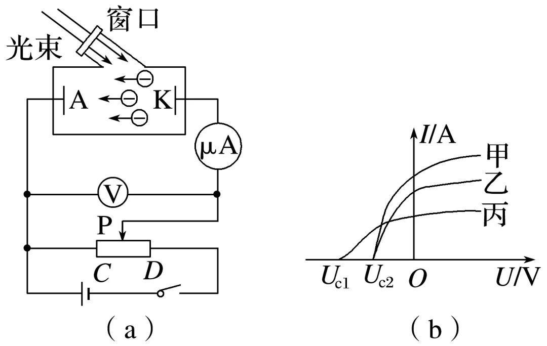 10.(多选)(2025·河南南阳市一模)光电管是应用光电效应原理制成的光电转换器件,在有声电影、自动计数、自动报警等方面有着广泛的应用。现有含光电管的电路如图(a)所示,图(b)是用甲、乙、丙三束光分别照射光电管得到的I-U图线,Uc1、Uc2表示遏止电压。下列说法中正确的是( )