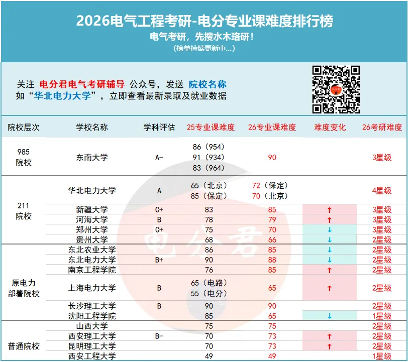 为助力2026级电气工程考研学子估分备战复试,同时为2027级考生提前明晰择校方向,水木珞研教务团队依托多年积淀的学科资源,结合最新考情动态、真题趋势与院校数据,对全国电气工程考研院校的电分专业课难度进行深度梳理与专业研判,现正式发布《2026电气工程考研-电分专业课难度排行榜》。本榜单作为水木珞研持续深耕电气考研领域的专业成果之一,将为考生提供权威、系统的择校与备考参考。