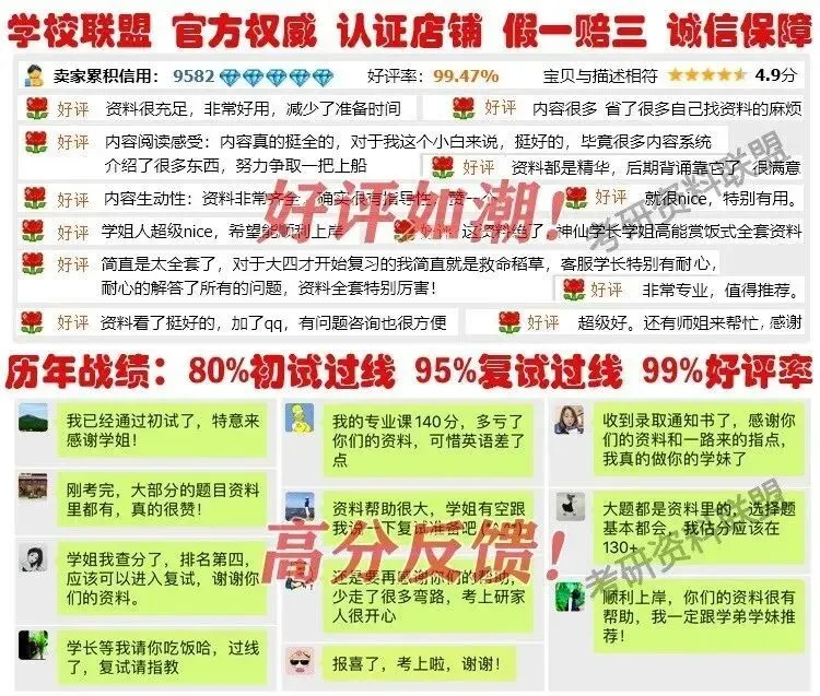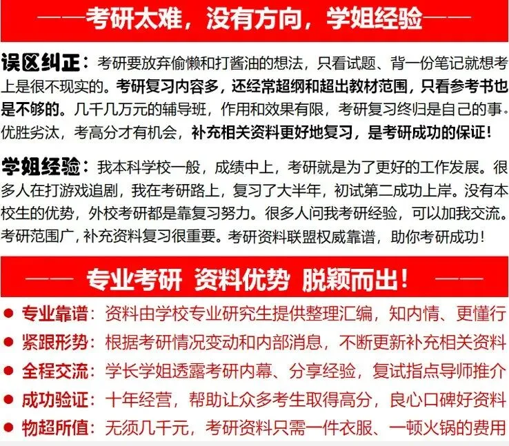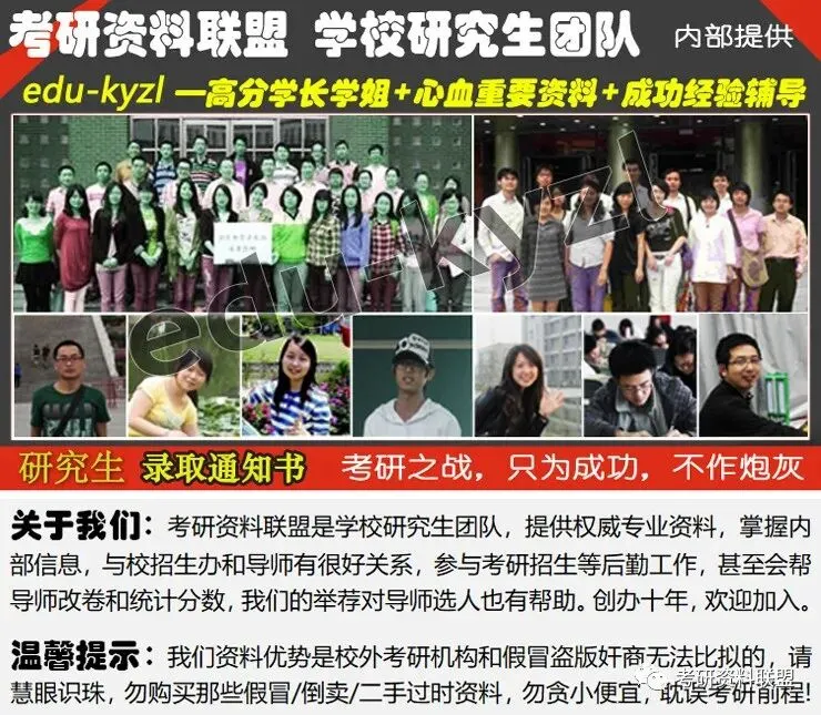 考研事关前途,好资料物超所值。尤其是专业课,都是学校自己命题,考研资料联盟由学校研究生团队组建,独家权威提供学校内部专业课资料!【学姐提示:请勿购买假冒/无用/过时的资料,误导前程哦!】