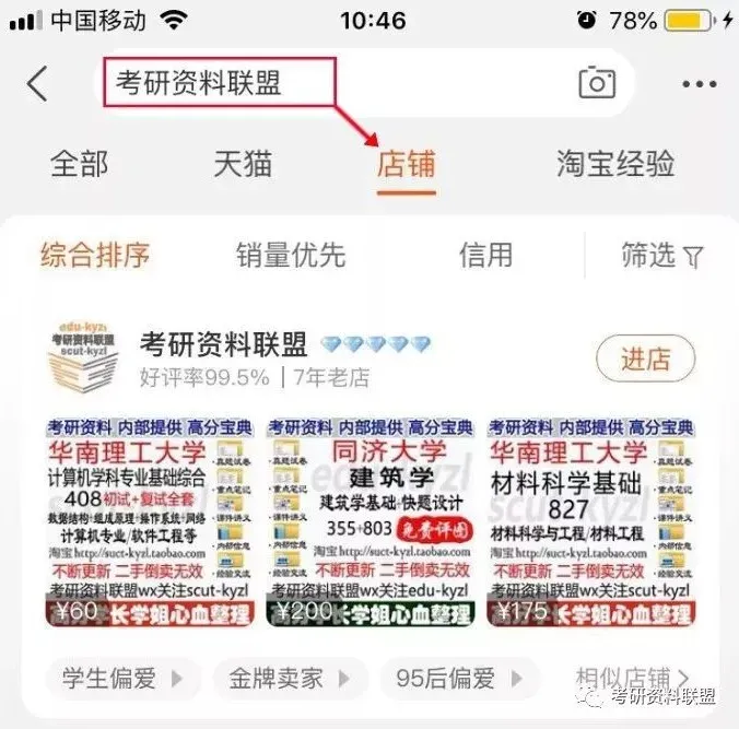 淘宝搜索“考研资料联盟”选择【店铺】