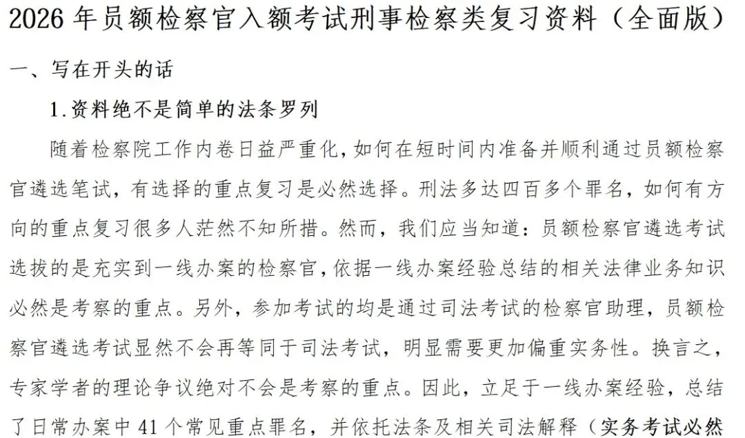 随着检察院工作内卷日益严重化,如何在短时间内准备并顺利通过员额检察官遴选笔试,有选择的重点复习是必然选择。刑法多达四百多个罪名,如何有方向的重点复习很多人茫然不知所措。然而,我们应当知道:员额检察官遴选考试选拔的是充实到一线办案的检察官,依据一线办案经验总结的相关法律业务知识必然是考察的重点。另外,参加考试的均是通过司法考试的检察官助理,员额检察官遴选考试显然不会再等同于司法考试,明显需要更加偏重实务性。换言之,专家学者的理论争议绝对不会是考察的重点。因此,立足于一线办案经验,总结了日常办案中四十余个常见重点罪名,并依托法条及相关司法解释(实务考试必然以此为基础),同时结合指导案例、刑事审判参考、学理上的一些通说观点总结了刑法分则与总则中的重点知识。与此同时,整理者还收集了一套江苏地区(官方公布)的真题(较老)、两套网络上个人回忆版的真题(较新)形成了本资料。资料既偏重于实务,又适当兼顾理论,无论是考察简答、案例分析,还是撰写起诉书(审查报告)时都可以使用。另外,因有些地区还会考察时政内容,笔者还搜集了近几年的时政热点。总之,资料既偏重于实务,又适当兼顾理论,无论是考察选择(包含时政)、简答、案例分析,还是撰写裁判文书都可以使用。