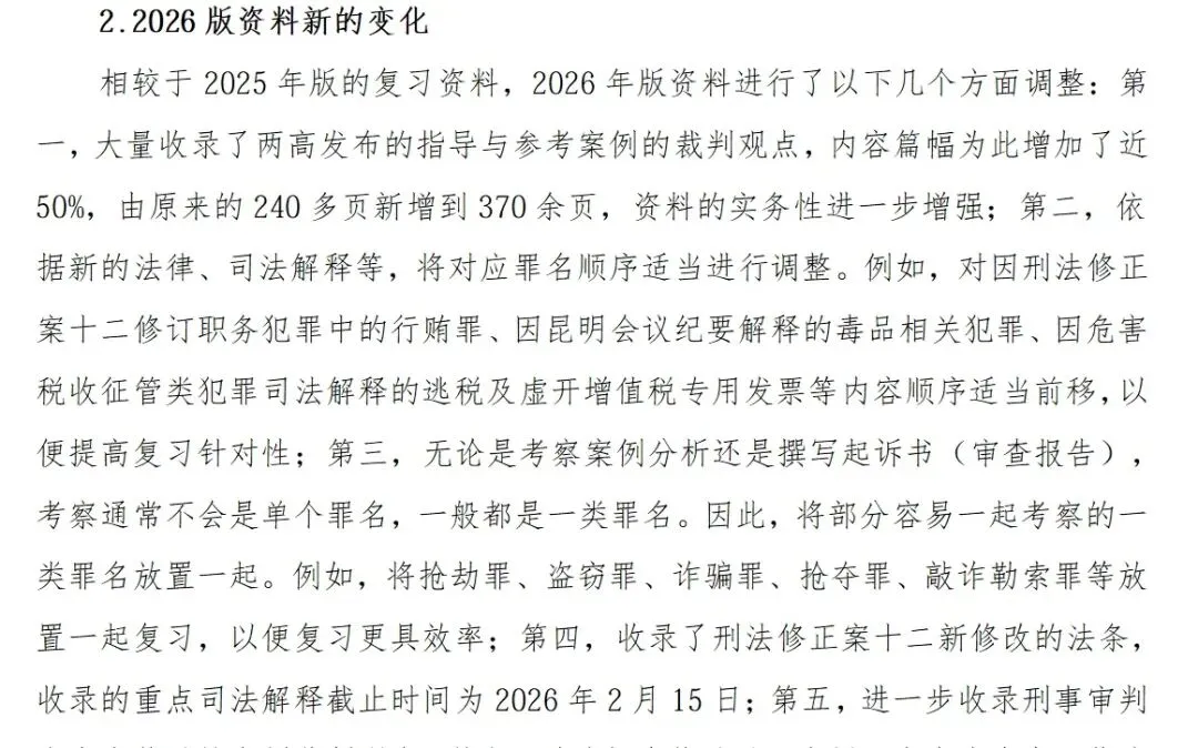 相较于上版的复习资料,2026年版资料已经升级为第三版资料。2026年版资料进行了以下几方面调整:第一,大量收录了两高发布的指导与参考案例的裁判观点,内容篇幅为此增加了近50%,由原来的240多页新增到370余页,资料的实务性进一步增强;第二,依据新的法律、司法解释等,将对应罪名顺序适当进行调整。例如,对因刑法修正案十二修订职务犯罪中的行贿罪、因昆明会议纪要解释的毒品相关犯罪、因危害税收征管类犯罪司法解释的逃税及虚开增值税专用发票等内容顺序适当前移,以便提高复习针对性;第三,无论是考察案例分析还是撰写起诉书(审查报告),考察通常不会是单个罪名,一般都是一类罪名。因此,将部分容易一起考察的一类罪名放置一起。例如,将抢劫罪、盗窃罪、诈骗罪、抢夺罪、敲诈勒索罪等放置一起复习,以便复习更具效率;第四,收录了刑法修正案十二新修改的法条,收录的重点司法解释截止时间为2026年2月15日;第五,进一步收录刑事审判参考中收录的案例裁判观点;第六,时政部分收录了二十届四中全会内容及截至2026年2月重要领导人关于检察工作的最新讲话要求。