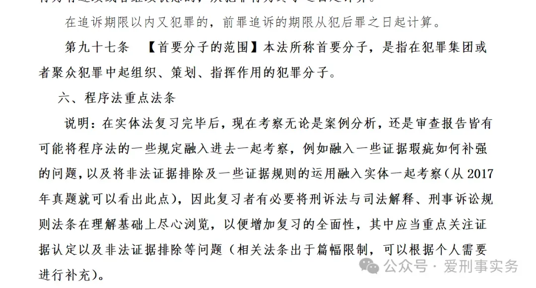 在实体法复习完毕后,现在考察无论是案例分析,还是审查报告,皆有可能将程序法的一些规定,融入实体法一起考察。例如,融入一些证据瑕疵如何补强的问题?非法证据排除问题?我们从2017年真题即可以看出此点。因此,笔者此处强调了刑诉法与司法解释、刑事诉讼规则的重要性,但笔者也进行了变通处理。即考虑到篇幅限制,没有将重要法条罗列。如果有需要的考生,可自行在电子版中进行补充。