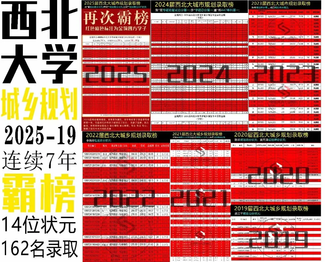 自2025-2019年七年期间,金筑四方共摘取西北大城规专业14大状元,共有162名学员成功上岸西大研究生。如果一年两年不足以证明,那么连续六年霸榜,就是实力彰显!