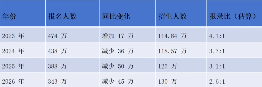 从数据来看,考研报考人数已经连续三年出现下降,从2023年的峰值474万降至2026年的343万,累计降幅超过百万。