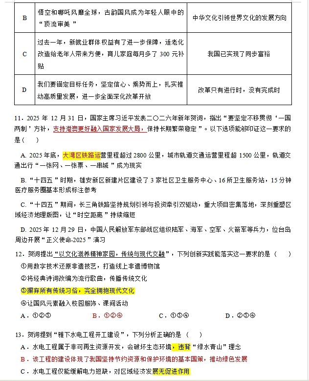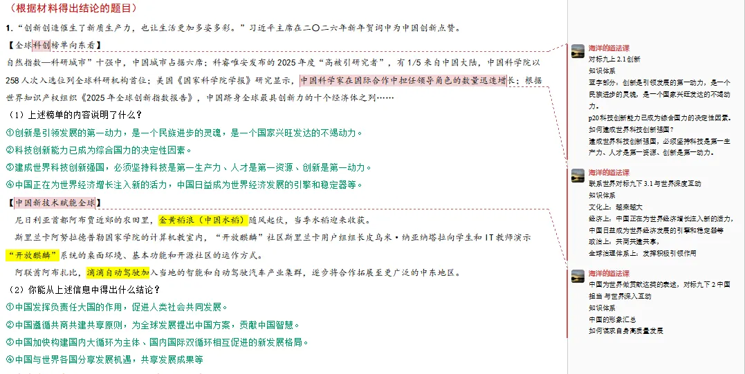这里是我根据新年贺词选取的一部分对应的非选择题。在非选择题目中,我特别注意设问的设计,比如:论证、认识、结论、底气的来源等等,不直白的设问,而且情境的选择也很符合命题要求,这一点我很满意。