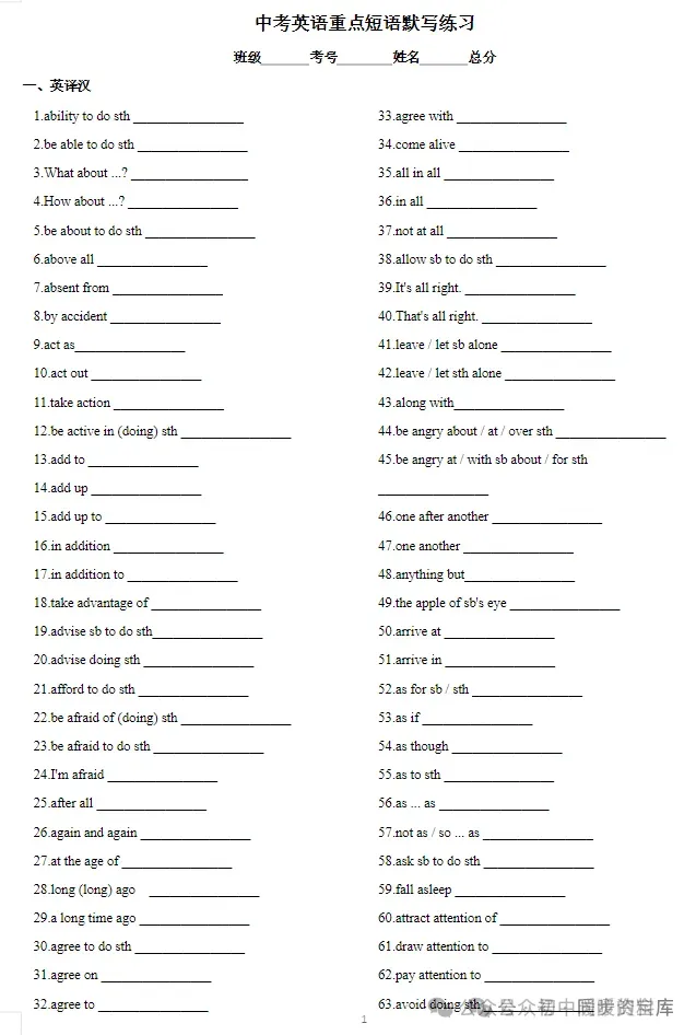 【初中资料】中考英语复习《重点短语默写练习》(英译汉+汉译英)(附链接可下载打印)