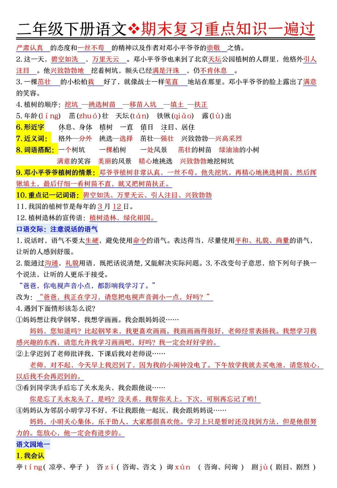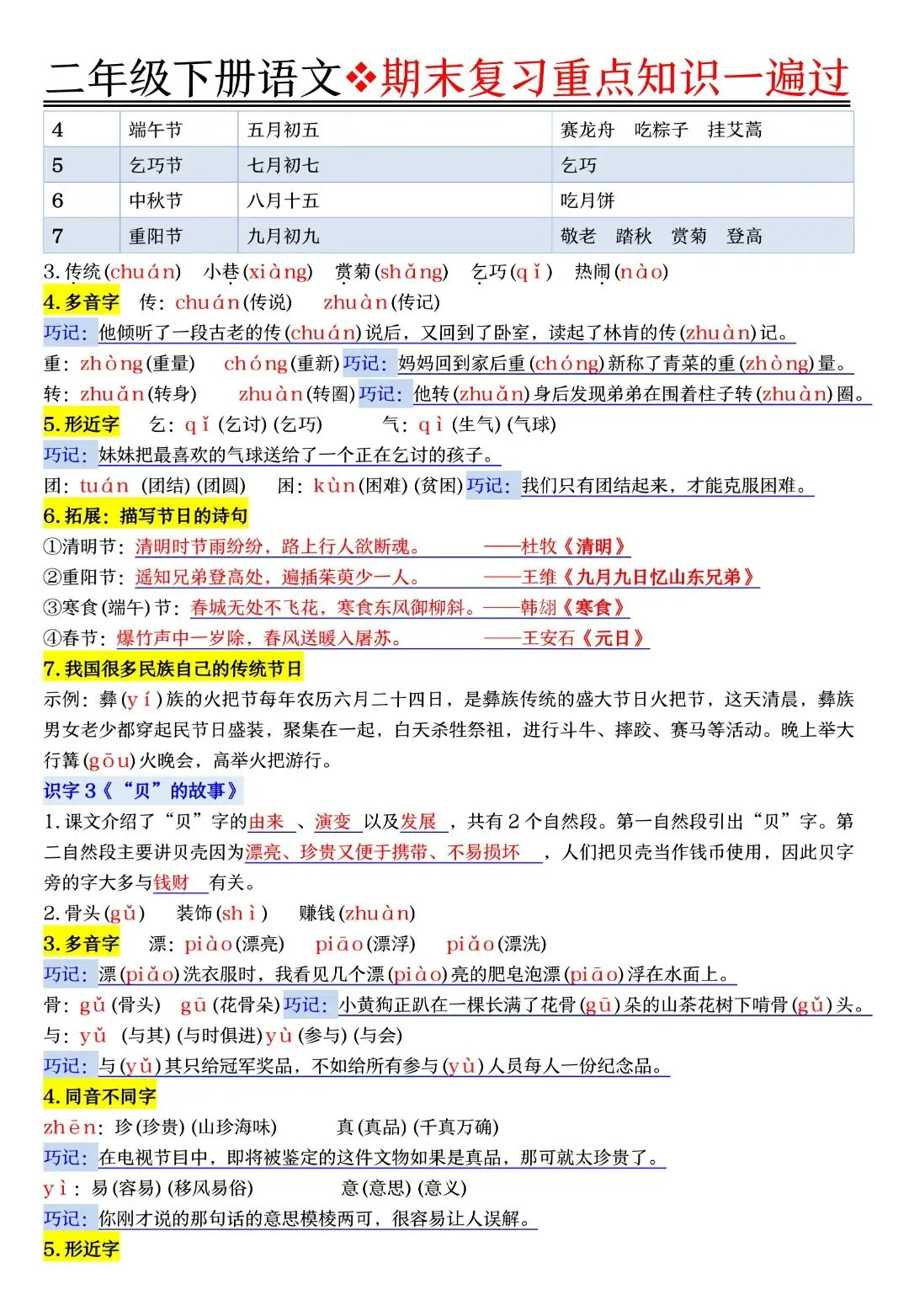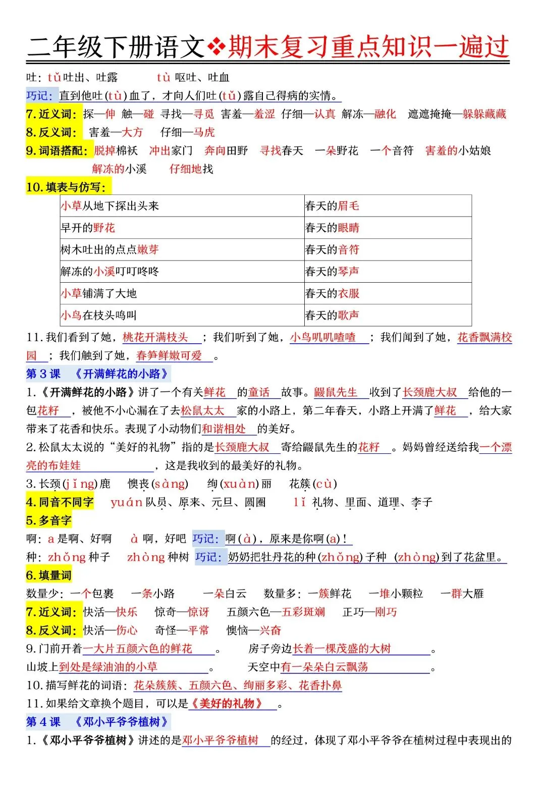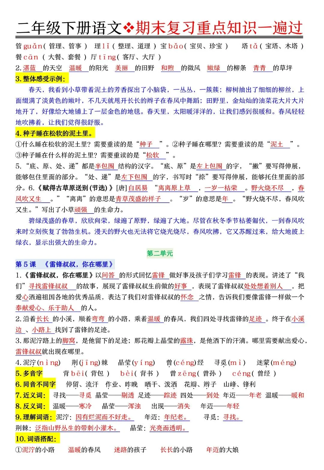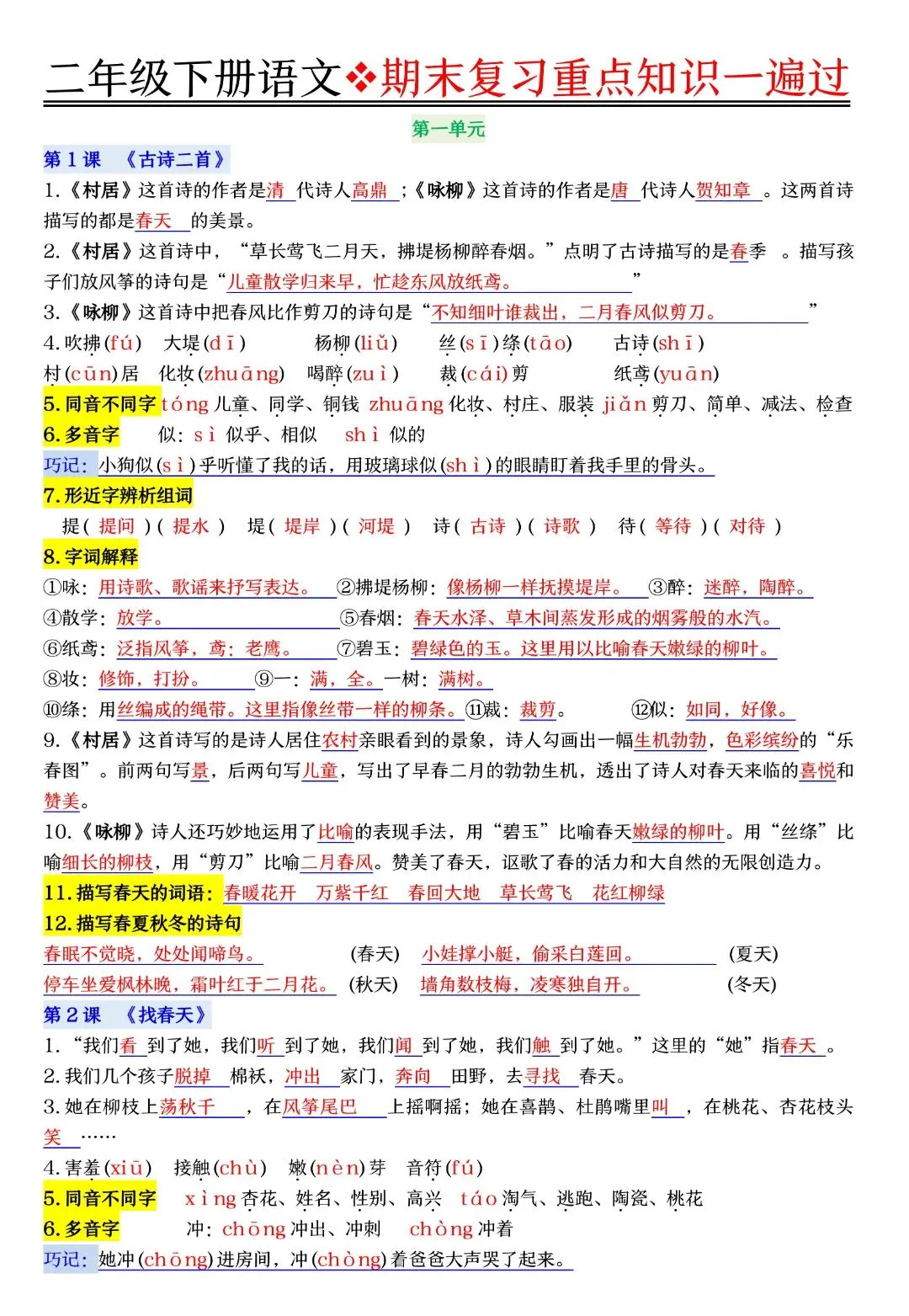 🌟大家好!今天给家长们分享的是2026春季二年级下册语文【期末复习重点知识一遍过】|完整电子版可打印!