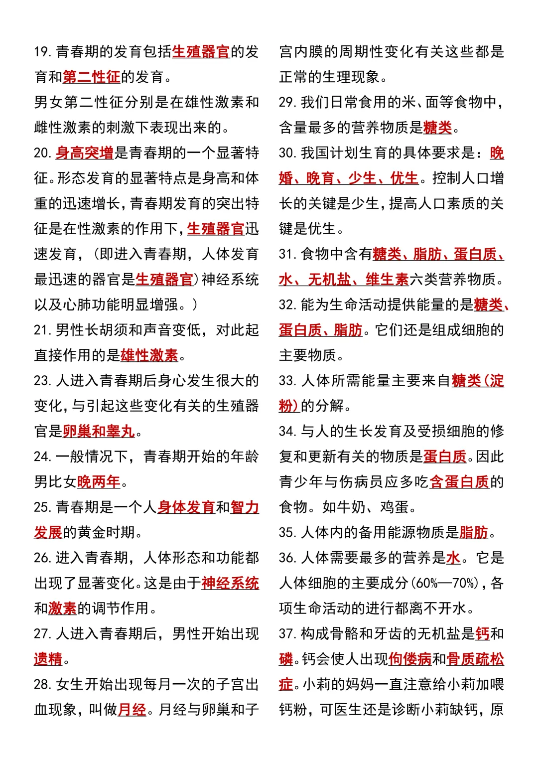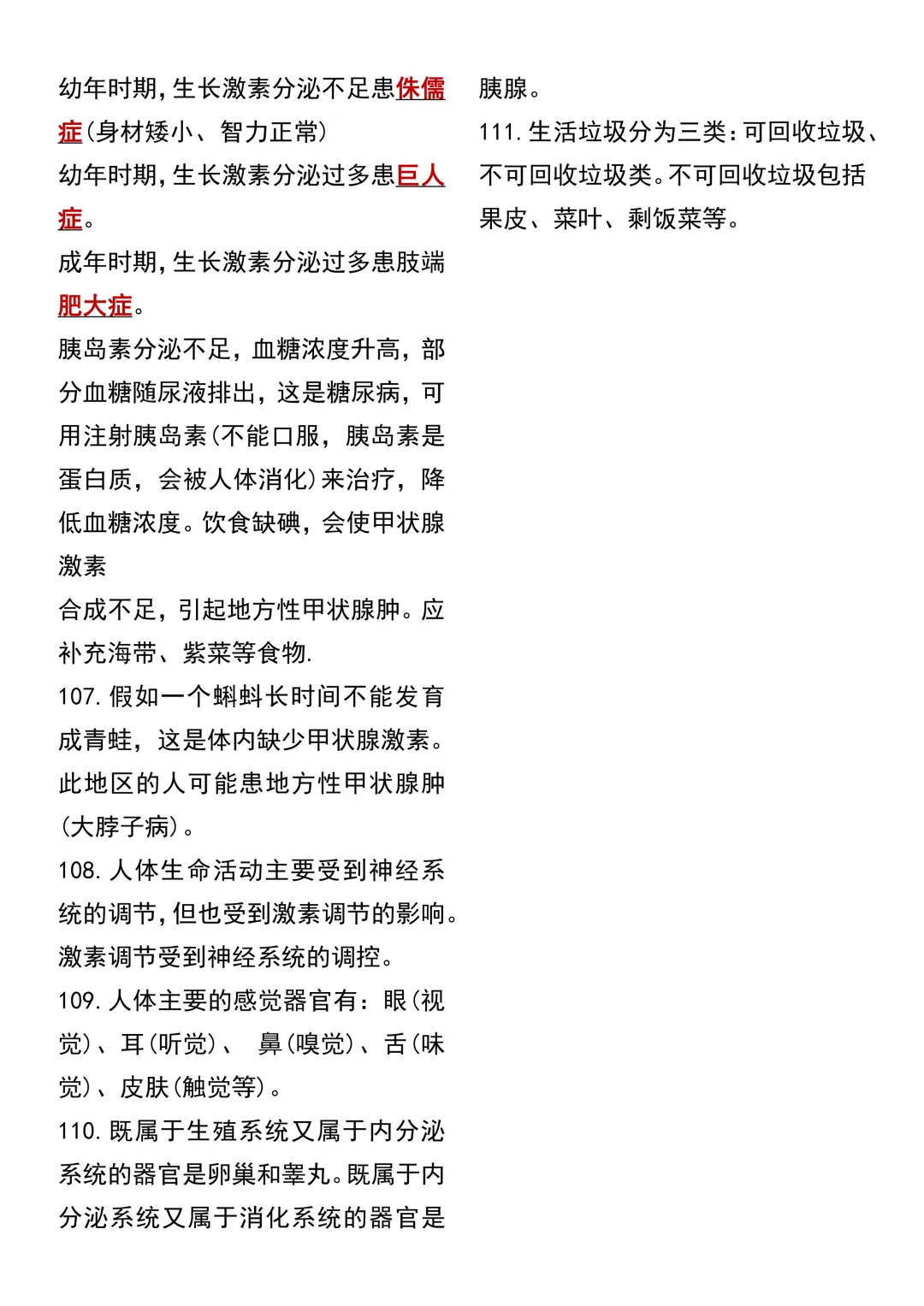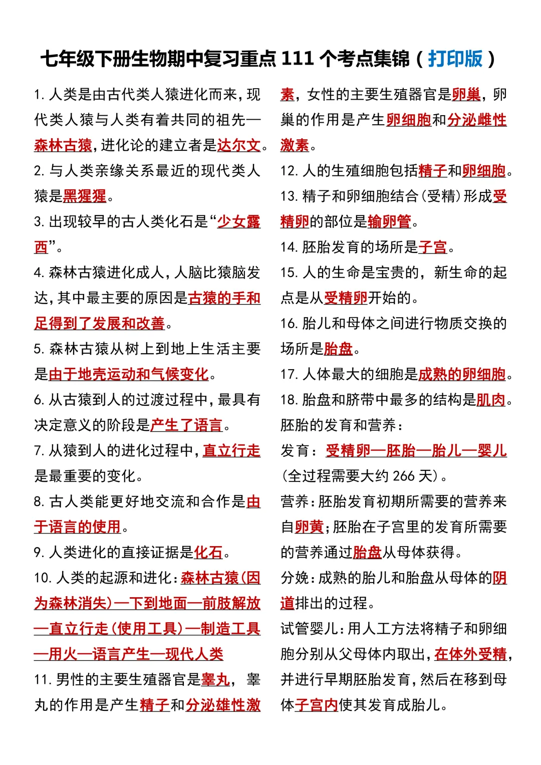 七年级下册生物 期中复习重点必考111个考点汇总(通用)!初一下册生物期中考点知识点集锦