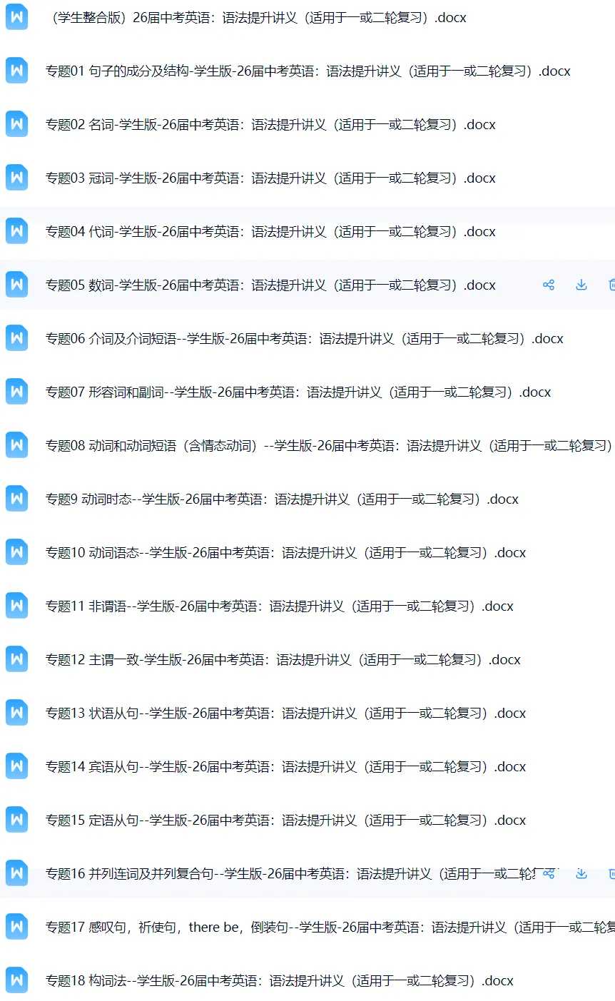 因为教材中的单元语法是比较分散的, 建议按照专题系统地去复习,效果会更好。因此我将语法单独整理成另一套系统的专题复习资料。 此套资料样板试看及内容介绍请,点击下面红色超链接查看: 【26中考英语】语法提升专题精讲精练(全国通用版),电子打印版下载!