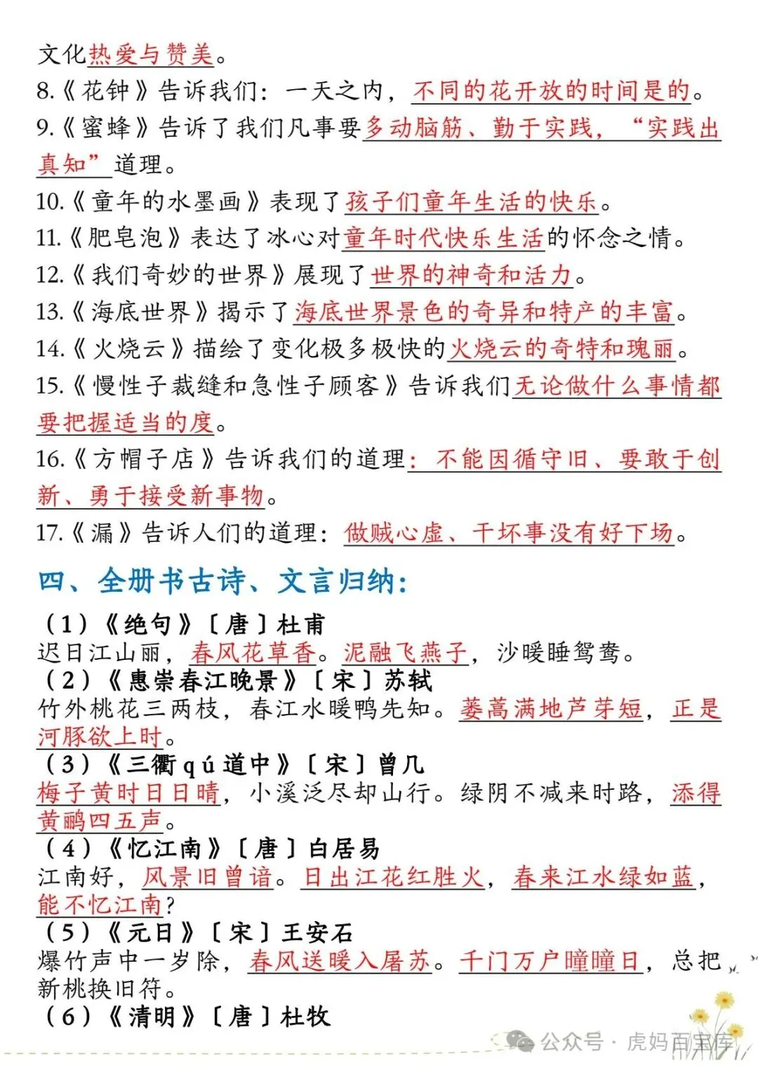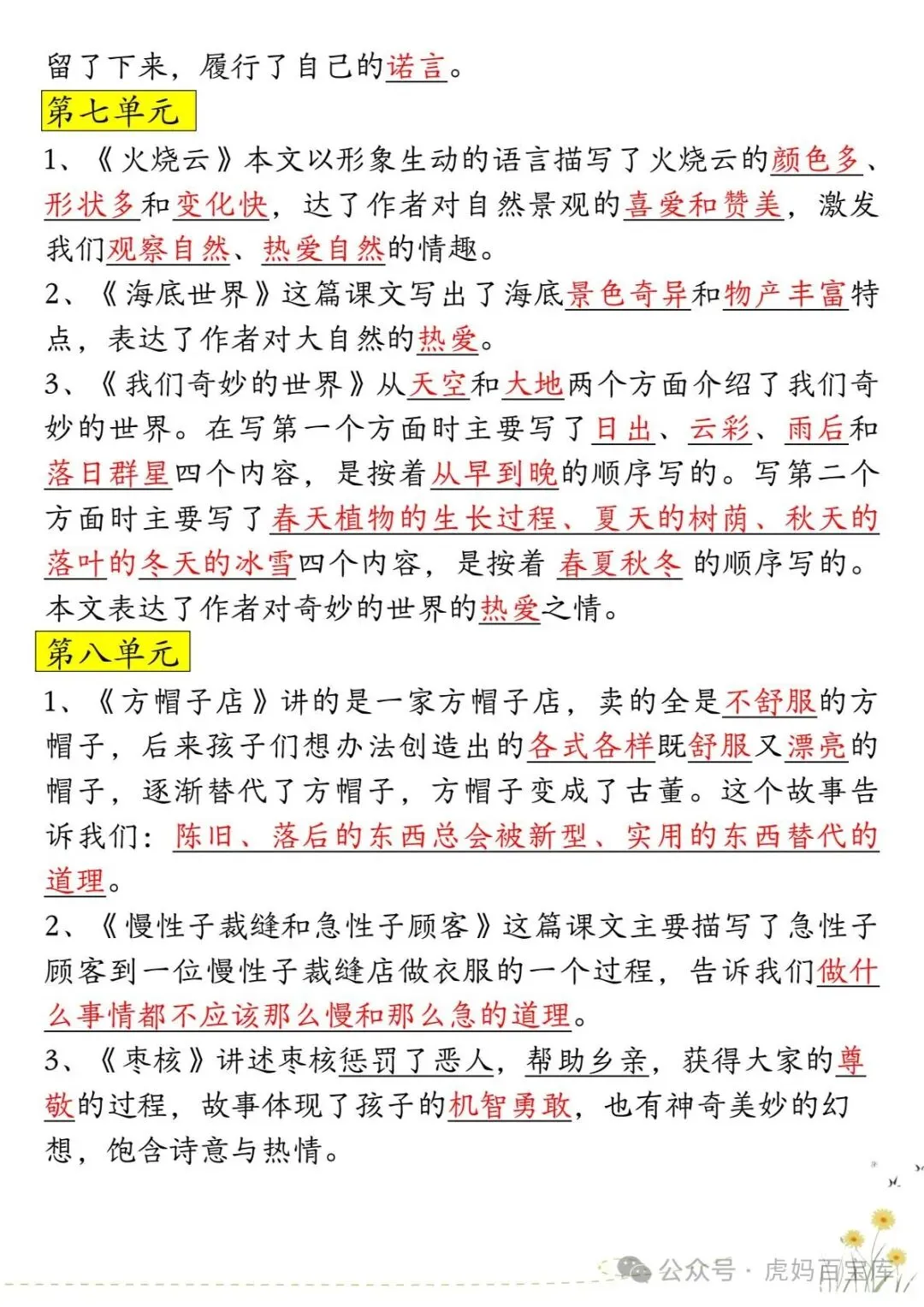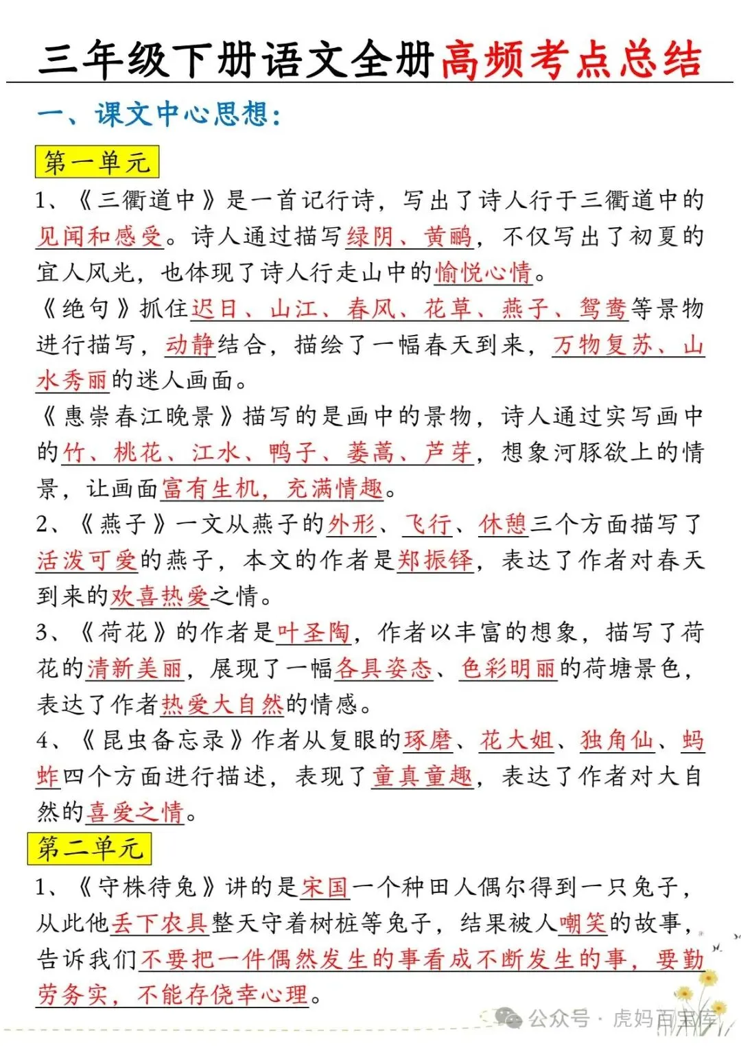 今天虎妈给大家分享的是:【期末复习】三年级语文全册1-8单元高频考点总结,共12页,电子版可下载可打印,这份三下语文全册高频考点总结,包含了课文中心思想、人物品质概括、课文说明的道理、古诗、文言文归纳、重点句子归纳等期末常考内容。文章末尾有完整电子版领取方式。可直接领取,无套路,欢迎收藏和下载。点击图片,查看大图
