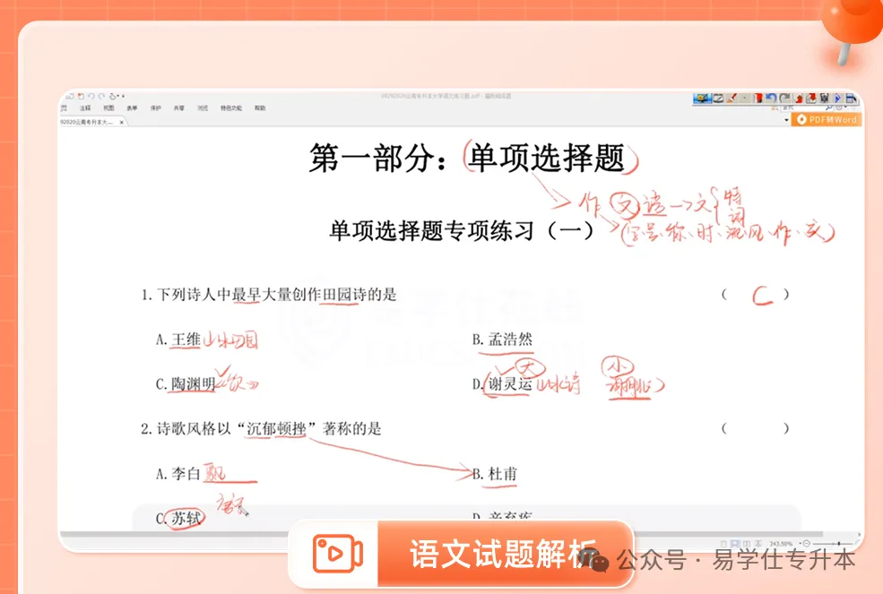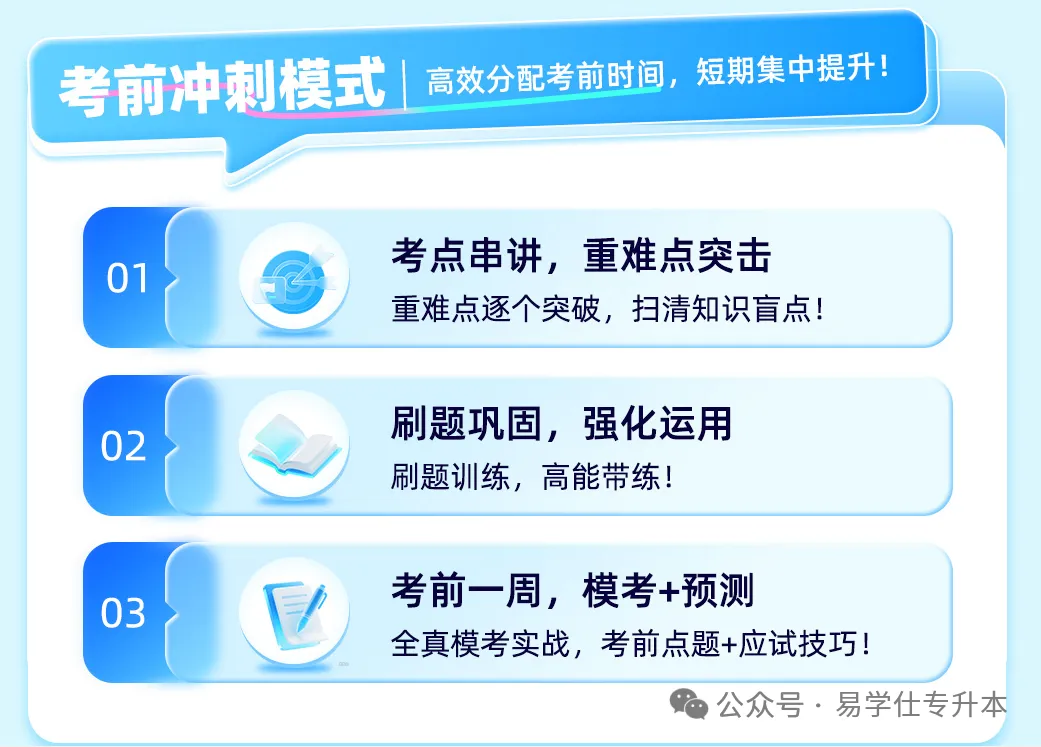 如果你专升本备考较晚,担心时间不够,想在考前再“急救”一下的同学,一定不要错过易学仕的考前冲刺班。