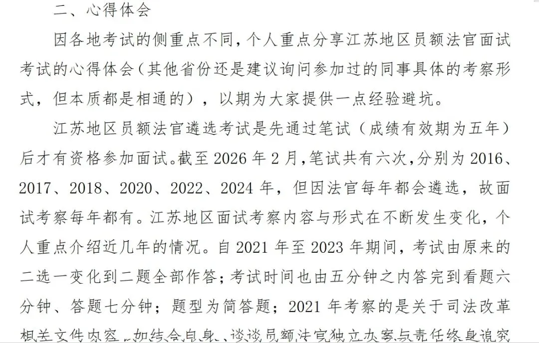 因各地考试的侧重点不同,个人重点分享江苏地区员额法官面试考试的心得体会(其他省份还是首选建议询问参加过的同事了解具体的考察形式,但本质都是相通的),以期为大家提供一点经验避坑。