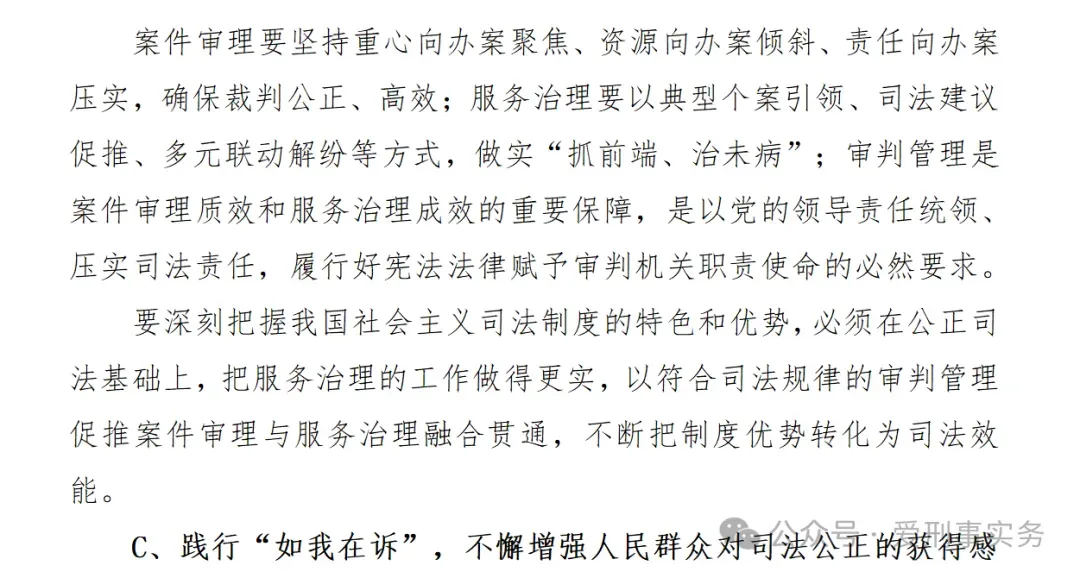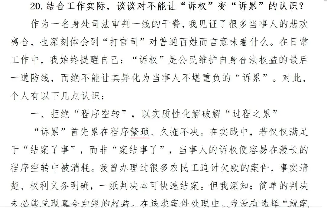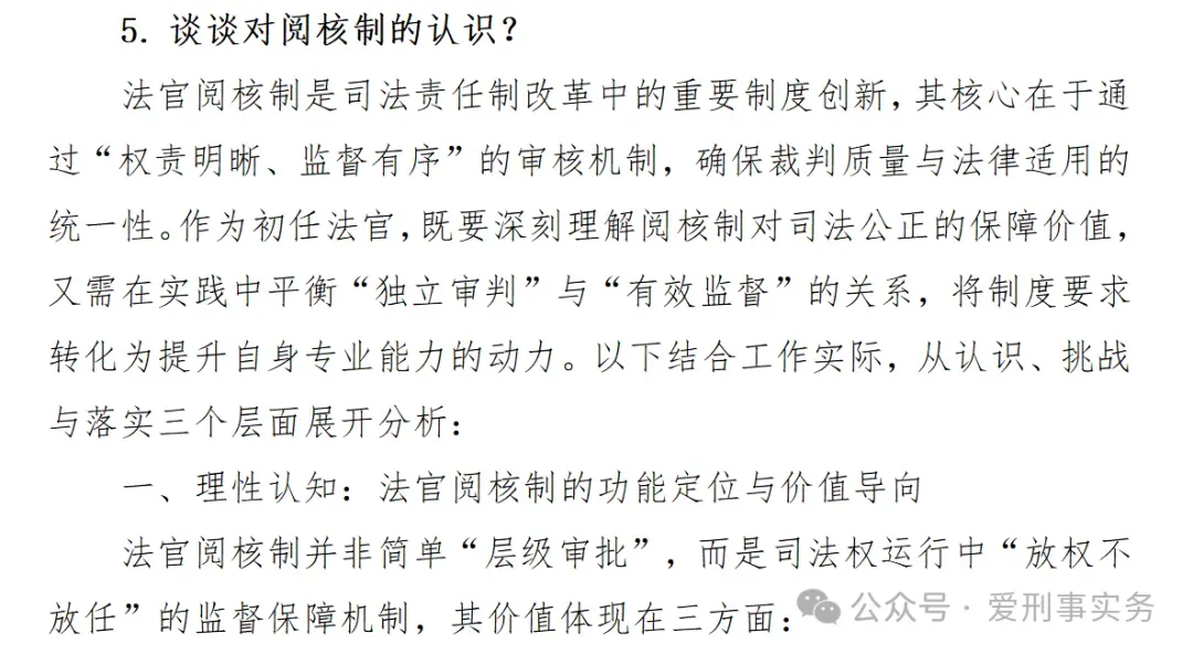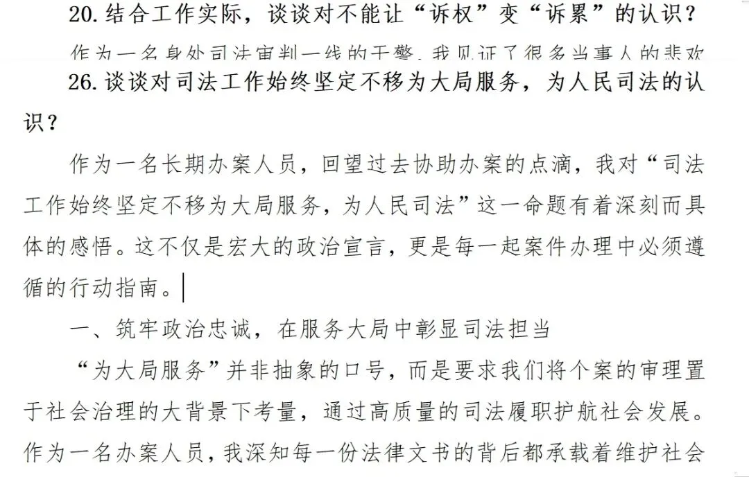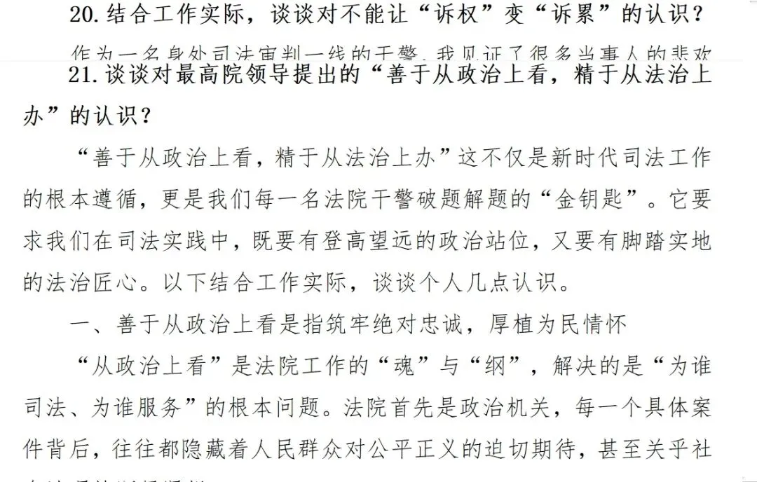 该部分主要介绍了实际面试中的一些心得体会,具体内容已经在上述第二部分进行了叙述。该部分主要介绍了复习的重点方向。经过总结近五年考察的真题内容,发现面试考察的重点主要集中在重要领导关于法治工作的讲话、司法改革重要制度、近三年总公司的工作重点(例如最近的枫桥经验、如我在诉司法理念等)、法理知识、法官法重要内容等方面。同时,问题不会是挖空式回答,多是结合自己作为初任法官的身份谈认识之类。该部分主要整理法官近年来需要学习的国家重大会议精神、重要领导关于司法工作的重要谈话与指示精神等内容,以便在面试中谈问题的认识时有话可说。同时,该部分内容往往也是考题的重要来源。所以,应当重点复习。该部分围绕法院近三年的工作情况,结合重要领导关于司法工作的要求以及遴选初任法官的身份,总结了一些出题点,并给出了参考回答。考生可以结合自己的实际,再进一步总结提炼,形成自己独有的部分。具体内容为(结合初任法官身份谈认识):1.谈谈如何在工作中贯彻“如我在诉”的司法办案理念?2.谈谈对2025年春季法官学院开学典礼讲话中领导提到的“定纷难,止争更难”的认识?8.谈谈如何在办案中坚持实现政治效果、社会效果、法律效果三者有机统一?10.谈谈对努力实现让人民群众在每一个司法案件中感受到公平正义的认识?13.谈谈如何在自己工作中提升自己政治能力、公正司法能力、能动履职能力、审判管理能力、狠抓落实能力(五个能力)?17.谈谈关于减轻基层负担,科学设置优化考核指标体系的认识?18.谈谈结合工作实际,如何加强裁判文书的释法说理?19.谈谈如何将中华优秀传统文化融入到工作实际中?20.结合工作实际,谈谈对不能让“诉权”变“诉累”的认识?