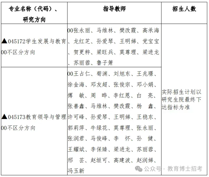 教育领导与管理方向(045173)招生对象:限招中小学教育管理者、高等学校行政管理人员以及高等学校组织部门任命(或聘任)的管理人员(高校双肩挑的干部需有组织部门的认定)。不招收教育行政机关工作人员及上述人员范围以外的人员。