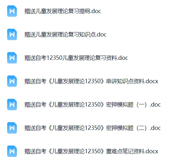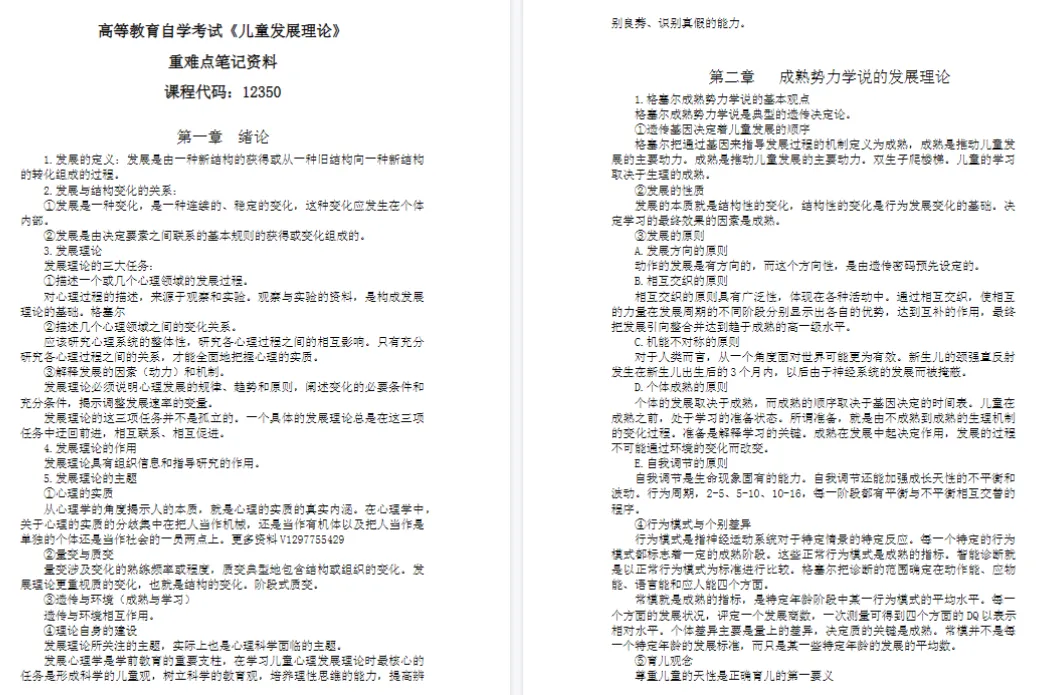 无论你是备考初期需要夯实基础、搭建知识框架,还是冲刺阶段想要借助真题提升应试能力,亦或是被某一难点困住难以突破,这份资料都能精准匹配你的需求。对于正为12350《儿童发展理论》全力奋战的自考考生来说,这样一份直击复习核心、助力高效提分的资料,无疑是不容错过的备考利器。