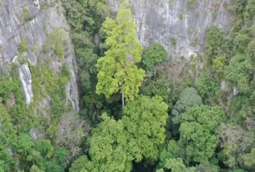 【2024·新课标卷.11~13】我国广西西南部某喀斯特地区(22.5°N附近),峰丛顶部多为旱生型矮林,峰丛洼地内为雨林,其顶层多被望天树(热带雨林的代表性树种)占据。2023年3月,调查人员在该地一个峰处洼地内发现了高达 72.4米的望天树(下图),打破了我国喀斯特地区“最高树”的纪录。据此完成下面小题。
