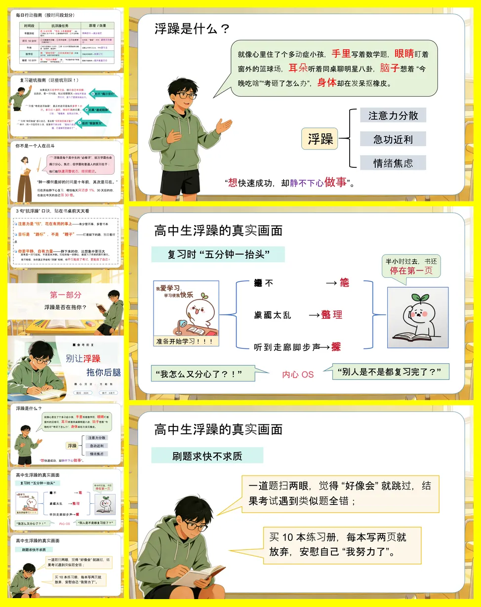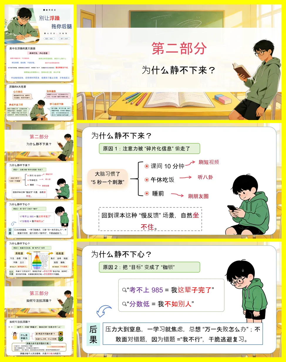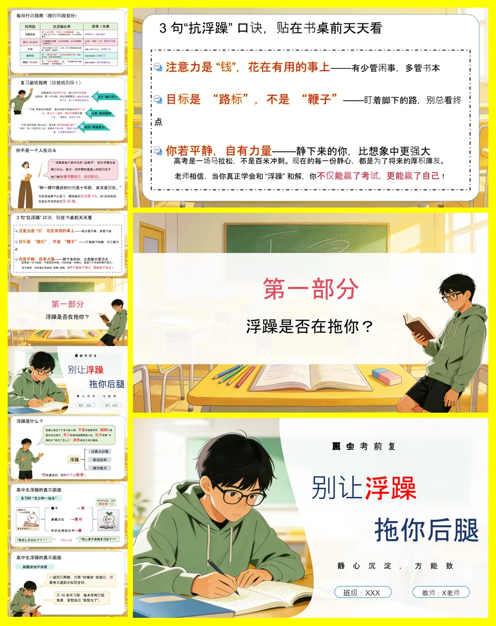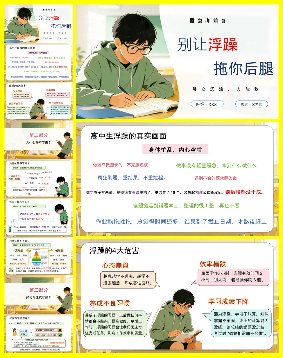 主题班会的核心是帮助高中生识别并克服考前浮躁情绪。浮躁表现为注意力分散、急功近利和情绪焦虑,其危害包括效率暴跌、心态崩盘和成绩下降。讲稿深入剖析了浮躁源于信息碎片化、目标压力及低能量传染。