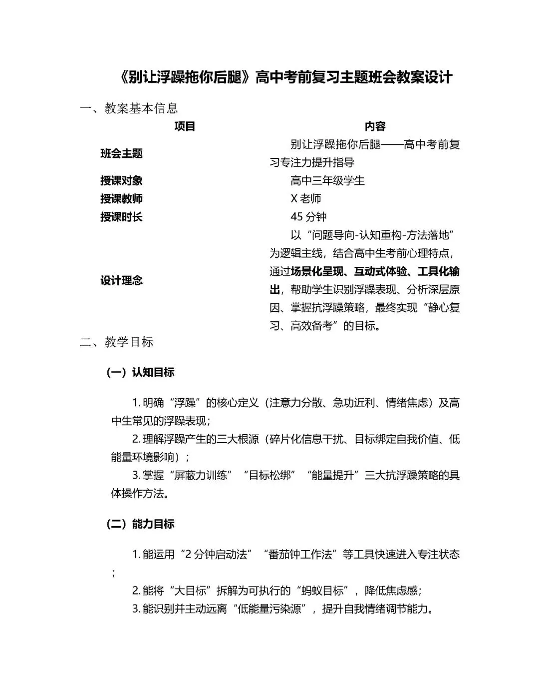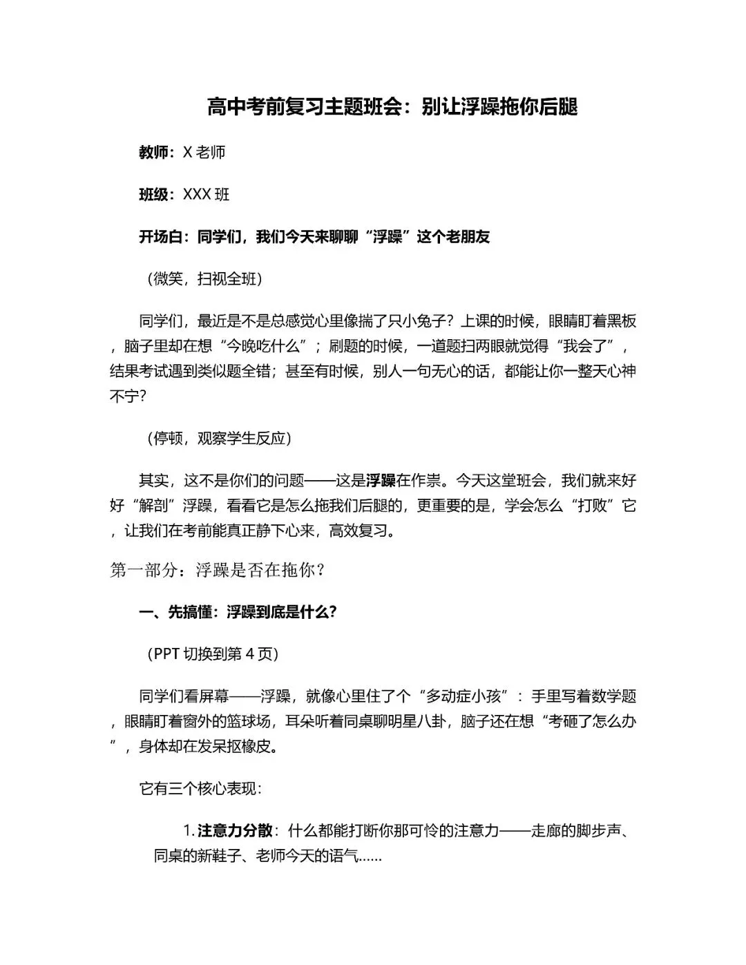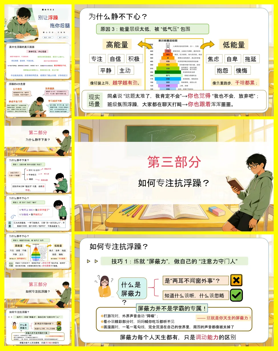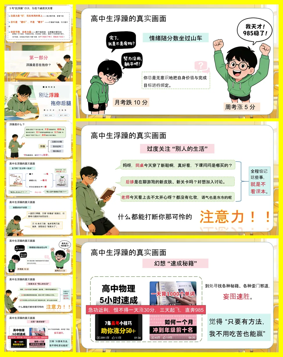 主题班会的核心是帮助高中生识别并克服考前浮躁情绪。浮躁表现为注意力分散、急功近利和情绪焦虑,其危害包括效率暴跌、心态崩盘和成绩下降。讲稿深入剖析了浮躁源于信息碎片化、目标压力及低能量传染。