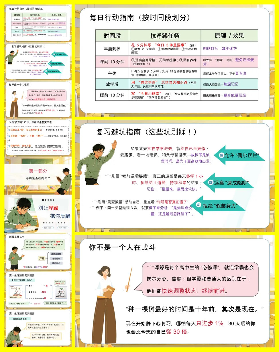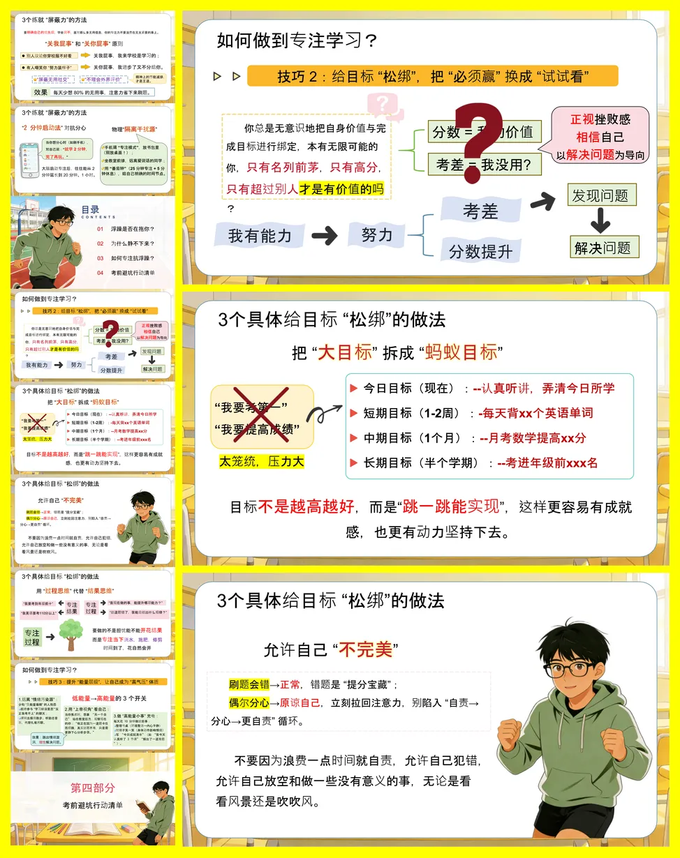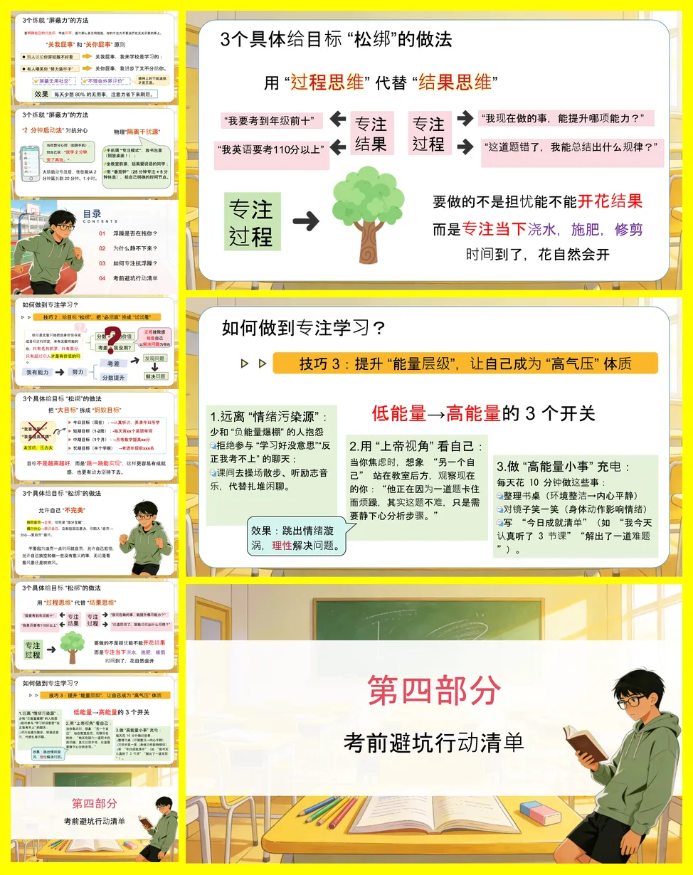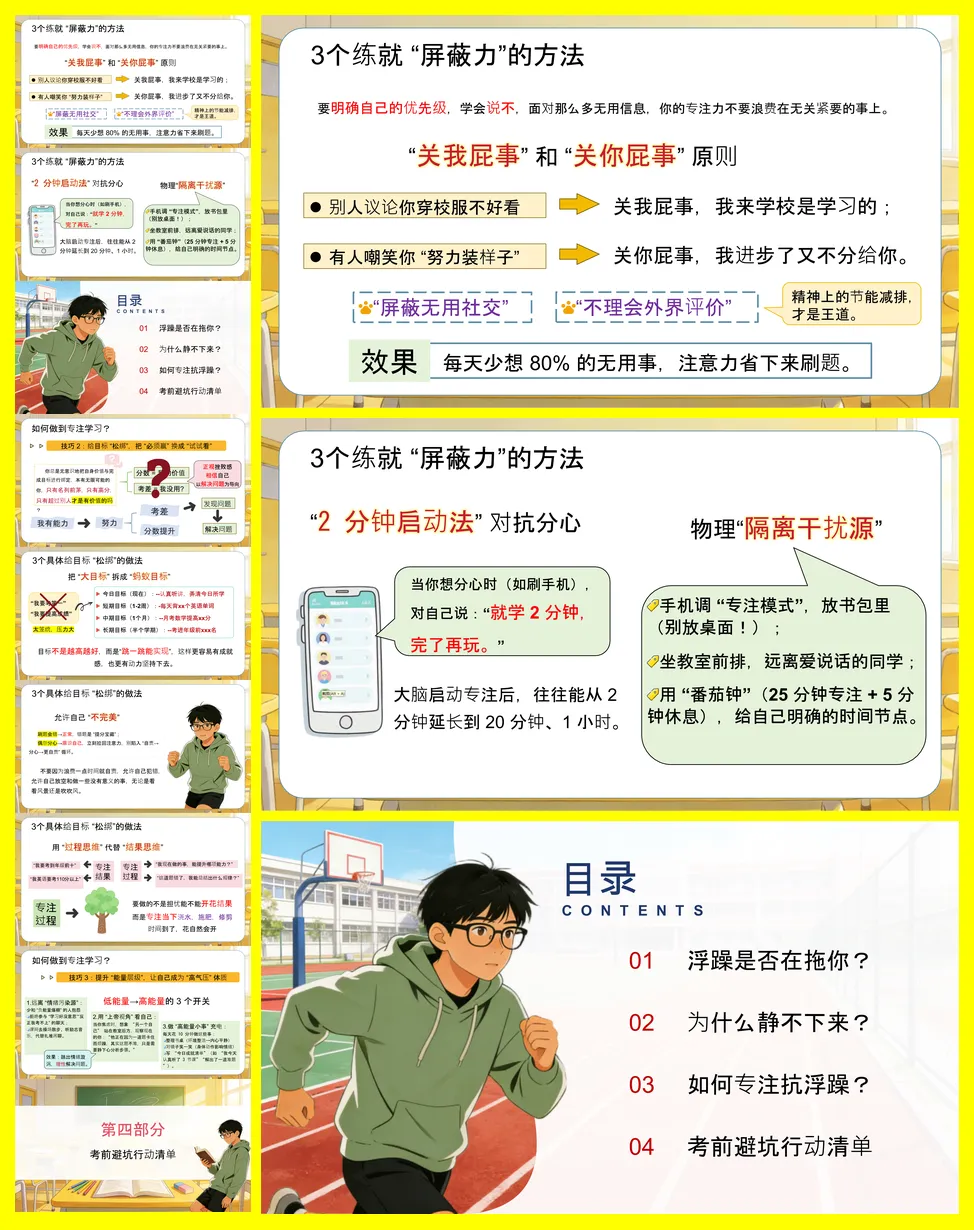 应对策略是重点,提供了三大技巧:一是练就“屏蔽力”,通过隔离干扰(如管理手机)、使用“2分钟启动法”和“关我屁事”心态来守护注意力;二是给目标“松绑”,将大目标拆解为可完成的“蚂蚁目标”,并专注过程而非结果;三是提升“能量层级”,通过远离负能量、用“上帝视角”理性看待问题及完成整理书桌等小事来充电。最后,讲稿给出了具体的每日行动指南(如写每日要事、课间休息),并警示了“假装努力”、“寻求速成”和“过度焦虑”三个需避开的坑。最终强调,真正的强大在于能快速从浮躁中恢复,静心沉淀。