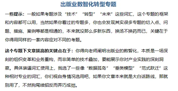 最后是完全来不及准备专题的,你对行业热点一无所知,那你拿去背一背,这10个专题大概率能撞上不少考题,到时候直接背到什么写什么,会有跑题的风险,但总归能写出东西来。