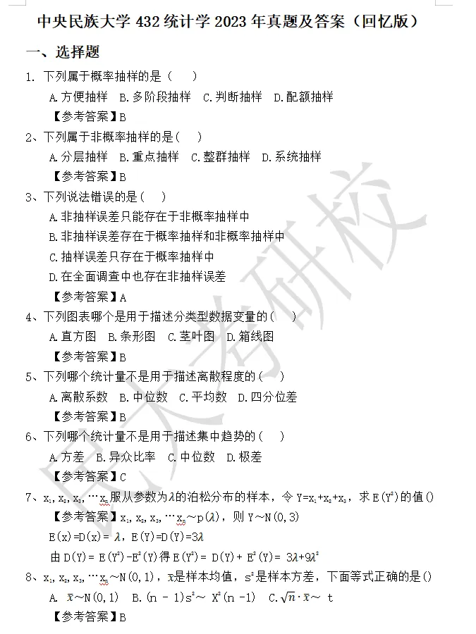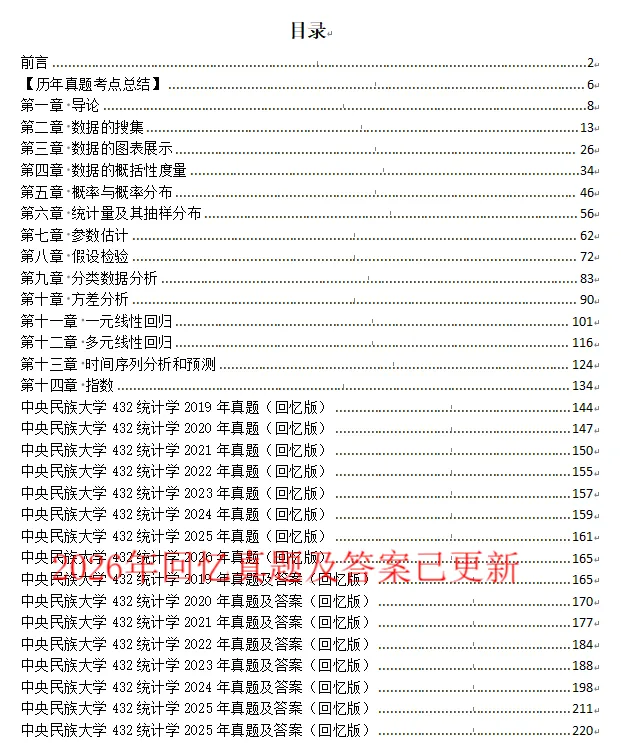 1、考点总结2、章节知识点总结3、历年真题及答案解析2019-2026年中央民族大学432统计学真题2019-2026年中央民族大学432统计学真题答案