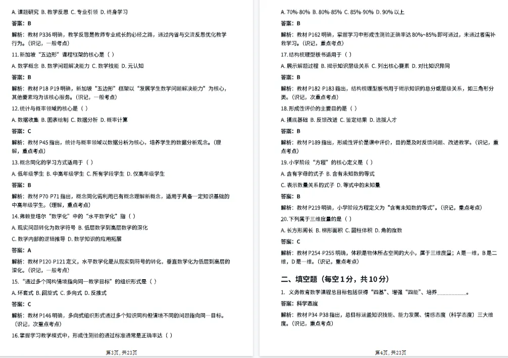 资料紧扣教材核心精髓,剔除所有无关冗余内容。它以章节为经、逻辑为纬,将本科目的核心考点与高频难点逐一拆解、条分缕析,把零散的教学理论、方法串联成脉络清晰的知识体系。你不用再花大量时间整理笔记,轻启资料便能精准锚定复习重心,彻底告别“复习像看新书”的混乱,让每一步备考都方向清晰、步履扎实。