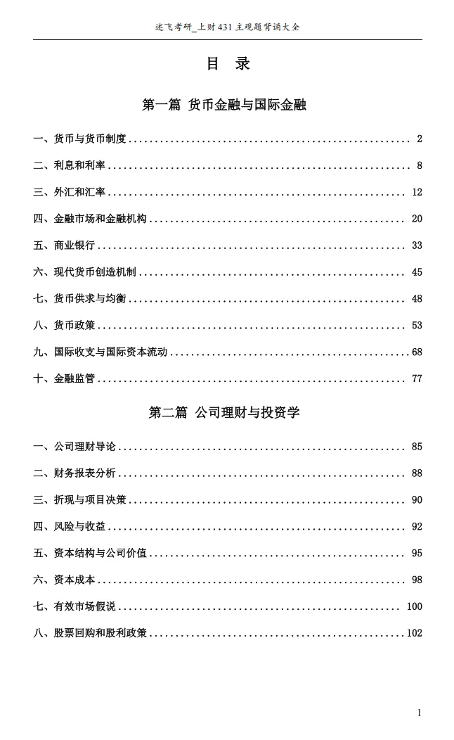 2. 全面覆盖考点:精选18个大章节,广泛涵盖货币金融学、国际金融学、公司金融和投资学四个上财考试科目。提炼出230个必考主观题知识点,总计100+页内容,无论是考前冲刺背诵,还是上财复试备考,都能为考生提供有力支持。
