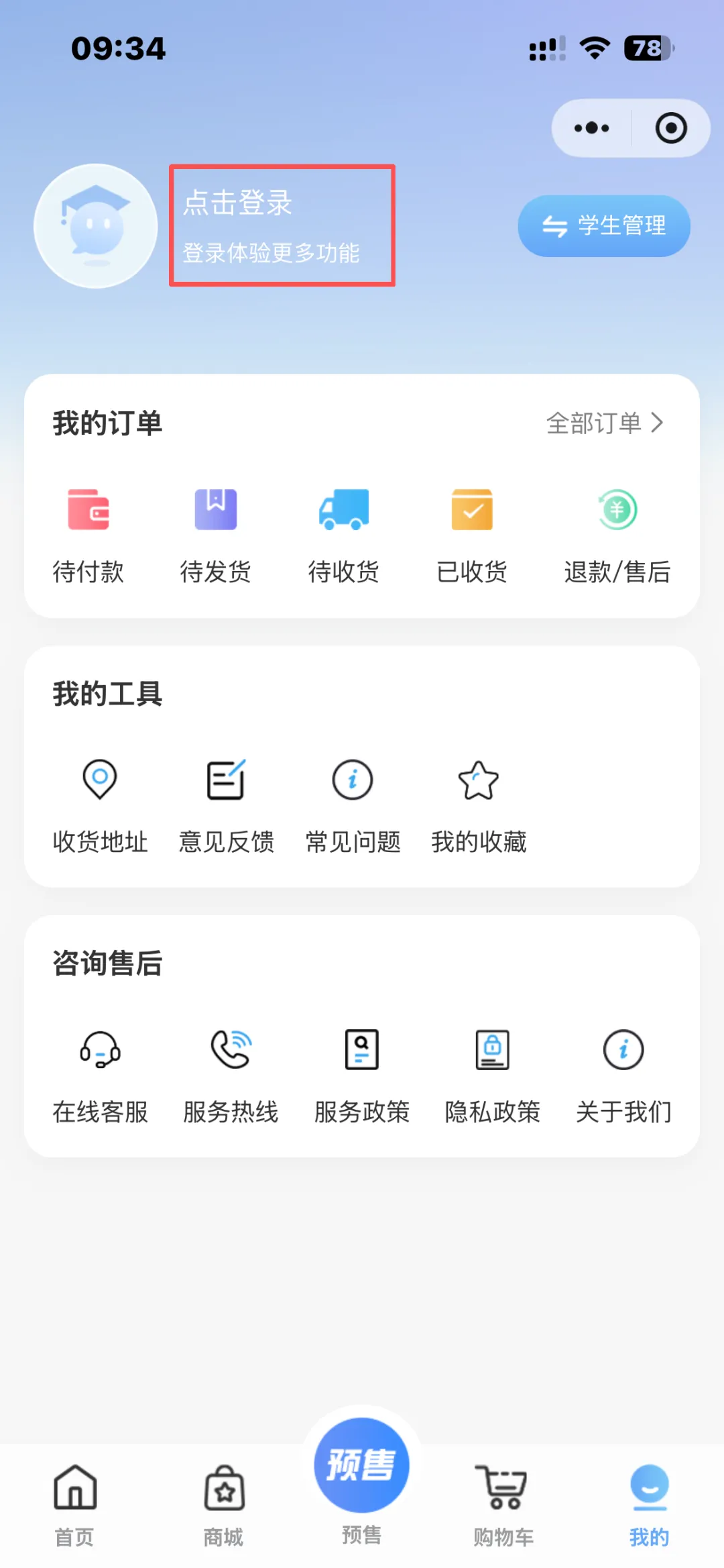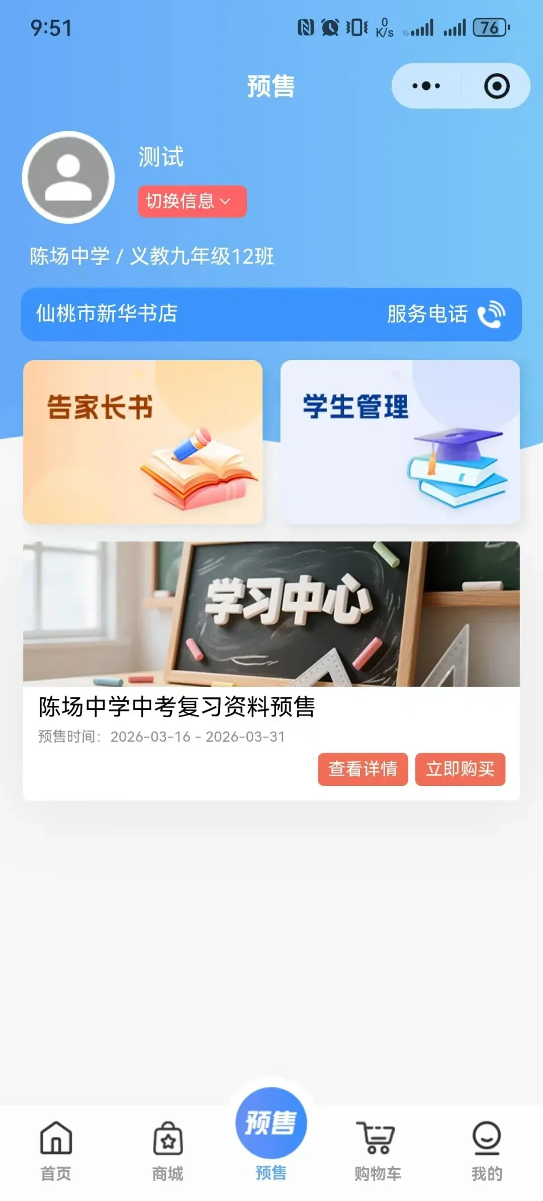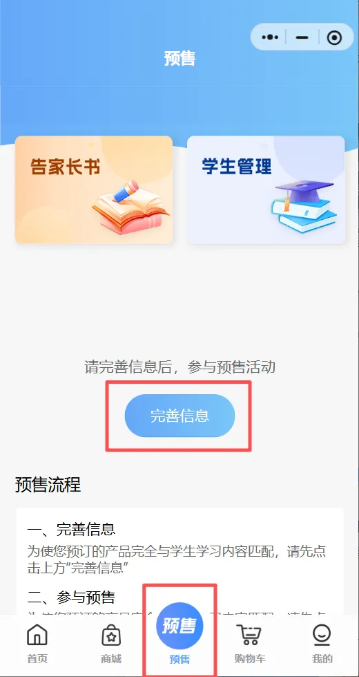 点击”预售“按钮,选择学生所在地区、区县,准确填写就读学校、年级、班级。