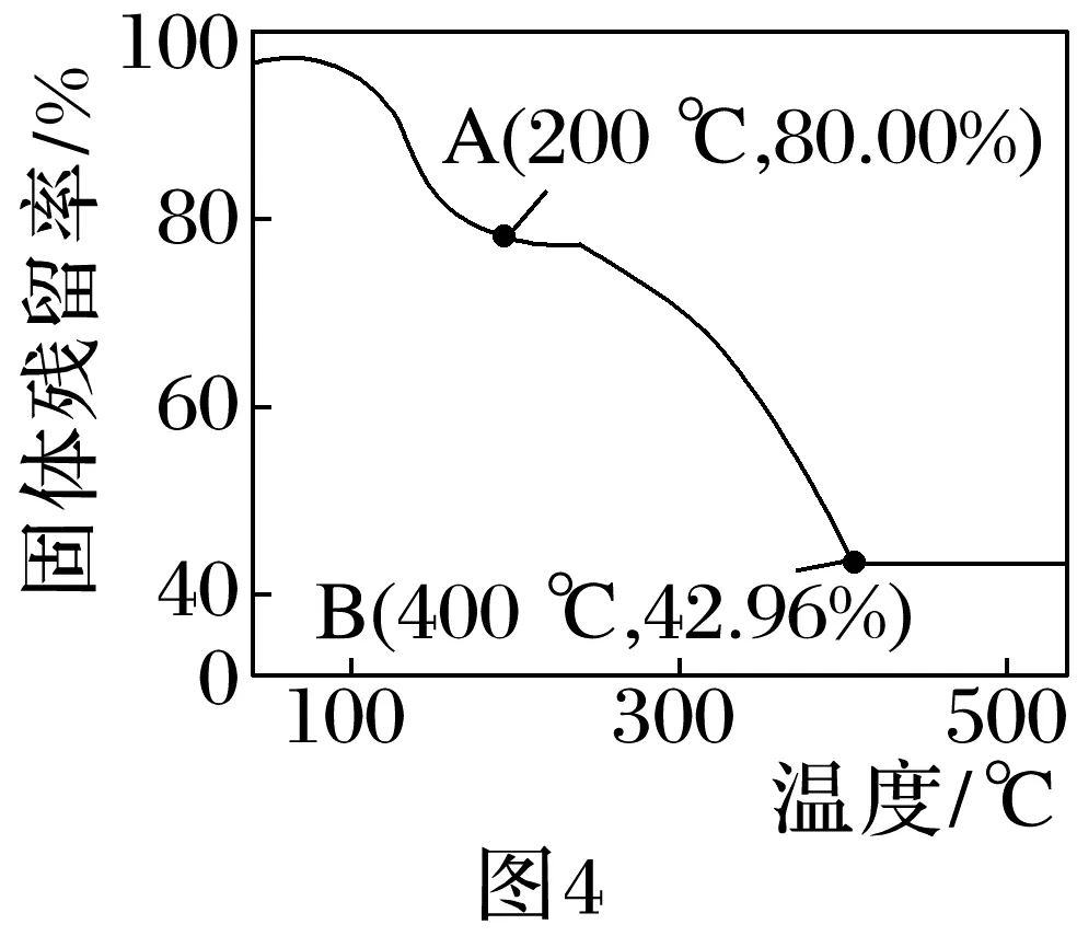 ×100%]随温度的变化如图4所示,B点时,固体只含有一种铁的氧化物,则AB段发生反应的化学方程式:。