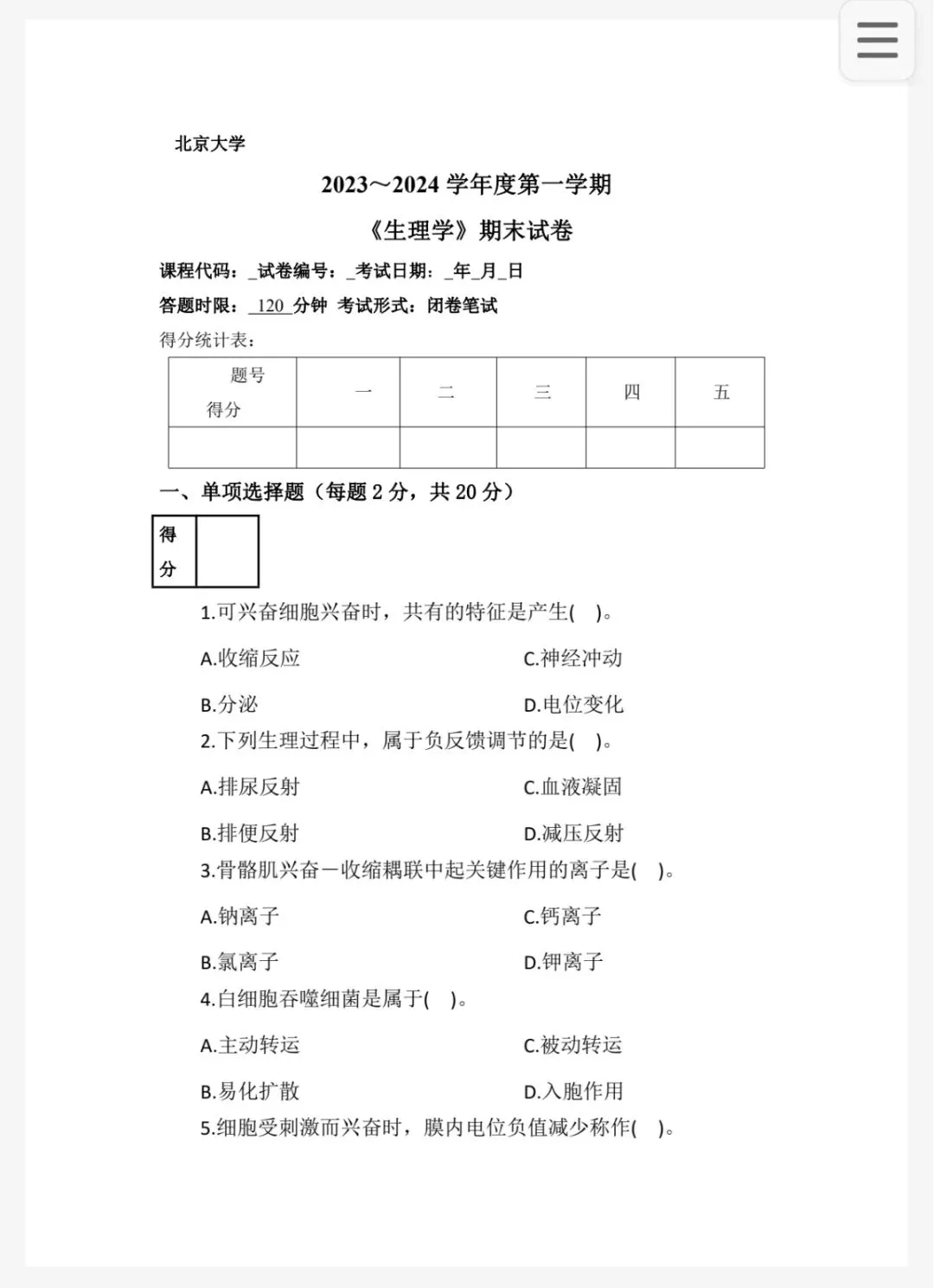 >裴建明等:大学生理学(第6版)+笔记+复习资料+重点总结+名校期末考试卷及答案PDF