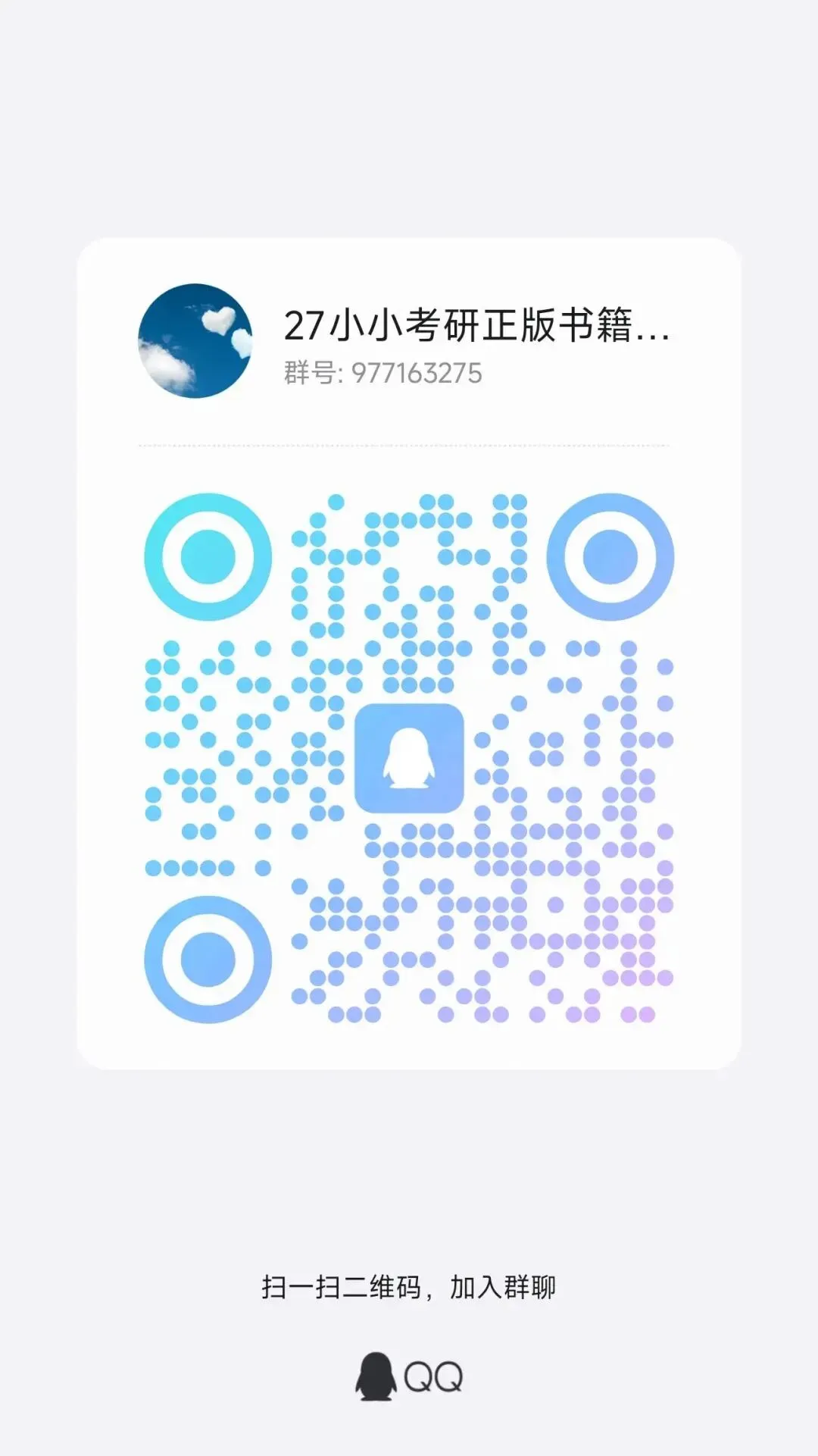 最后补充一下,小小创办了一个正版考研书籍的分享群,平时会分享一些书籍优惠券,找的券都是天猫旗下商家给的,都是正版书籍,有天猫平台保障,大家可以放心,有意向的同学可以加入下面的群。欢迎大家扫码添加qq群,省钱钱!qq群号:977163275麻烦大家点个“赞”和“在看”呀~