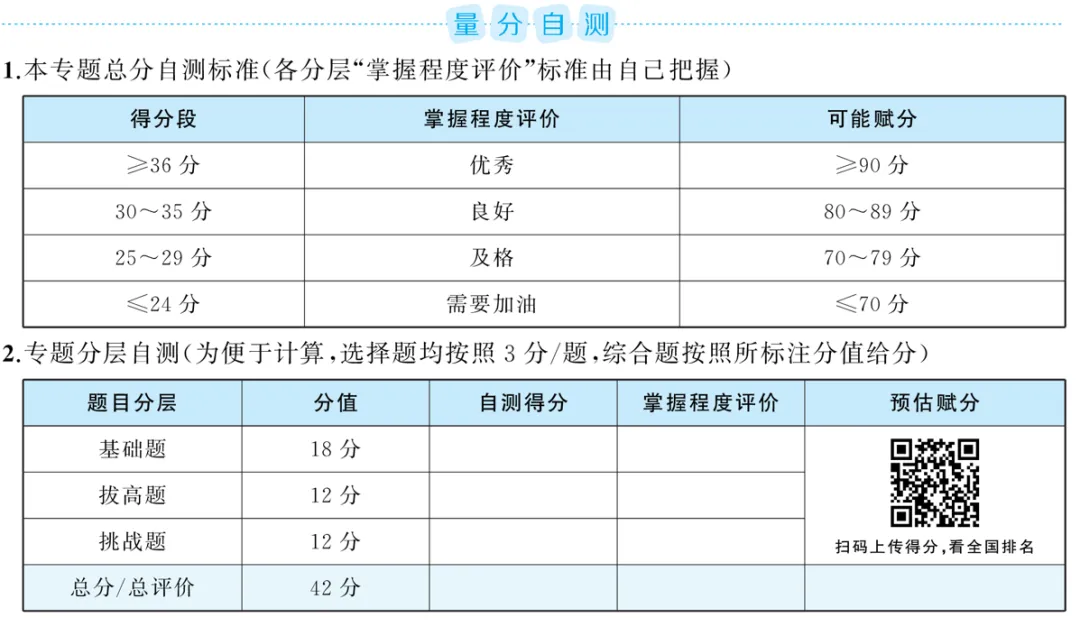 同时我们设置了一个量分自测表格,根据每个考向以往出现的考查频次和题目难度划定评分标准,给出了得分所对应的预估赋分。