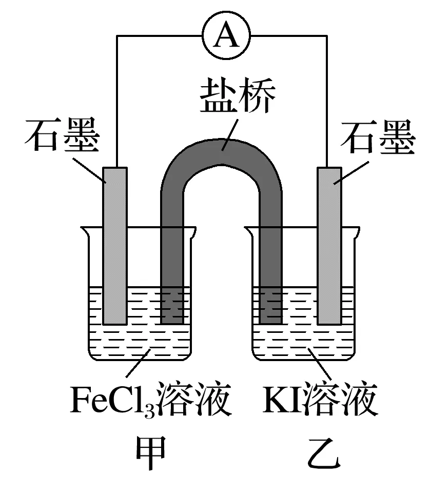 总反应:2Fe3++2I- 2++I2 | ①反应开始时,负极为乙中的石墨,电极反应式为2I--2e-===I2; ②当达到化学平衡状态时,向甲中加入FeCl2固体,此时负极为甲中的石墨,电极反应式为Fe2+-e-===Fe3+ |