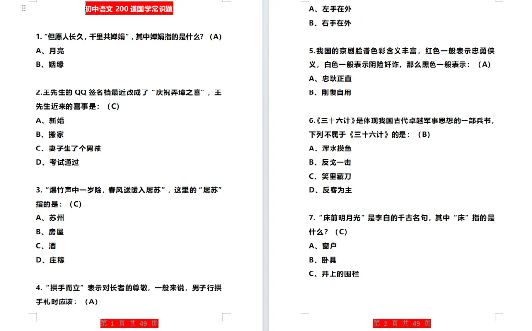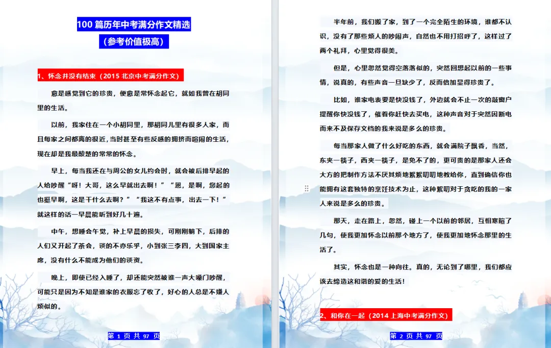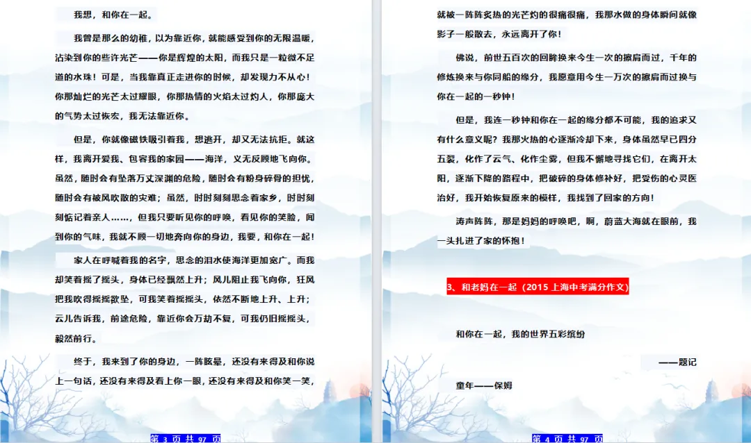 七、作文写作技巧与素材库满分作文写作技巧文档系统总结了标题拟定、开头与结尾的多种模式(如设问、名言、倒叙、排比等),并提供27种开头、20个主题的范文与点评。万能素材库囊括了比喻、排比、引用古诗词、名人事例等常用修辞手法,配以精选句段,帮助学生在限定时间内快速构思、充实内容。作文押题合集与满分作文精选则展示了不同主题(成长、亲情、社会责任等)的高分范例,学生可通过模仿与分析,提升语言表达与结构组织能力。