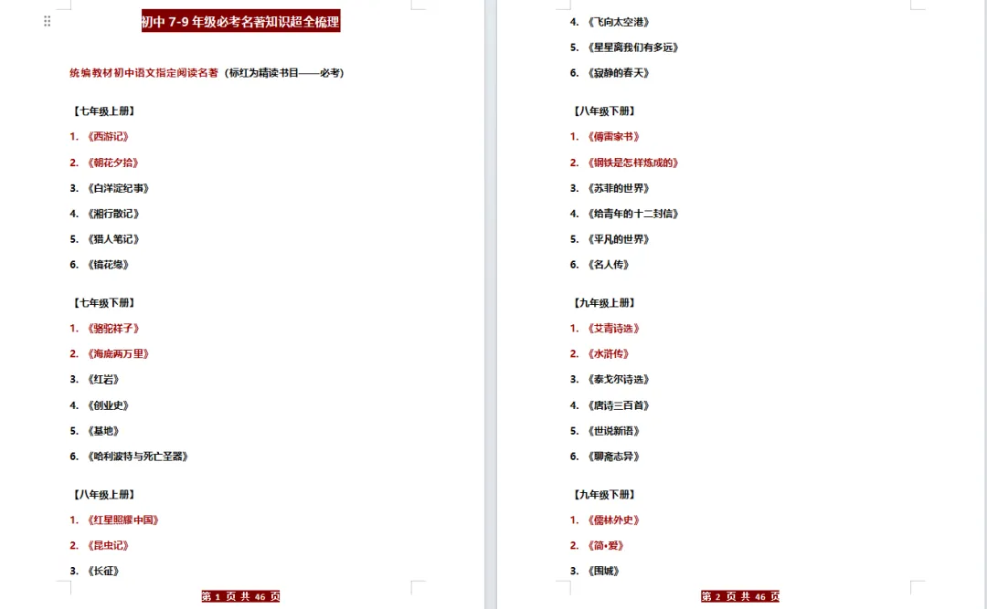 六、名著阅读与考点整合必考名著包括《朝花夕拾》《西游记》《骆驼祥子》《红星照耀中国》等,分别提供作者简介、内容概述、人物分析、主题思想以及艺术特色。每部作品配套的考点梳理与专项练习题,覆盖情节概括、人物形象、作品价值等核心要点。通过“章节概括”与“知识点+练习题”双向设计,学生能够在阅读原文后快速定位考点,提升答题效率。