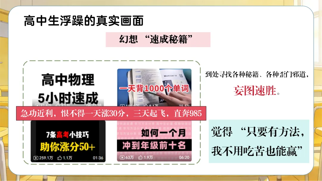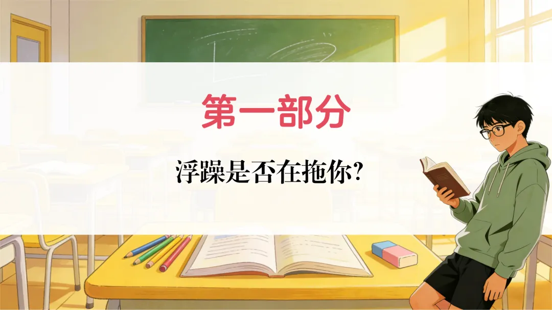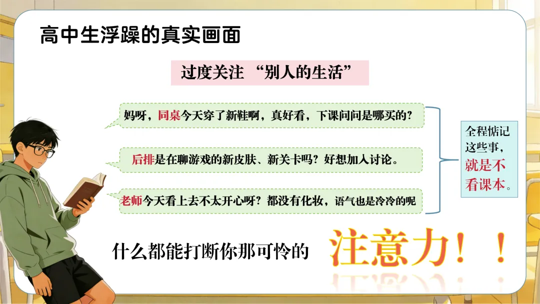 其实,这不是你们的问题——这是浮躁在作祟。今天这堂班会,我们就来好好“解剖”浮躁,看看它是怎么拖(模仿学生动作:假装翻书,突然抬头看窗外)