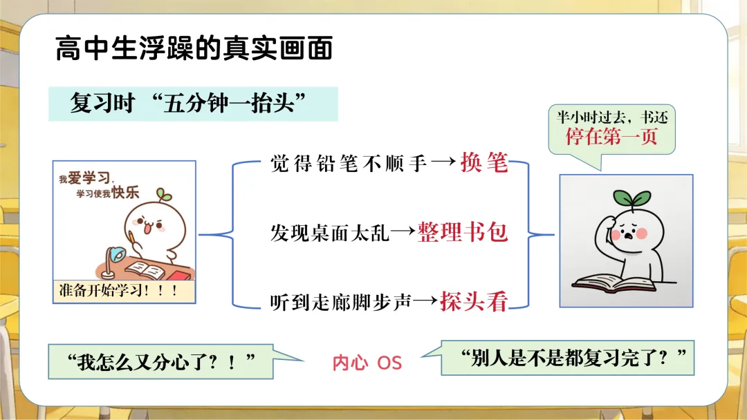 有没有同学这样?半小时过去了,书还停在第一页——一会儿觉得铅笔不顺手,换笔;一会儿觉得桌面乱,整理书包;刚准备开始,听到走廊脚步声就探头看……内心OS:“别人是不是都复习完了?我怎么又分心了?!”